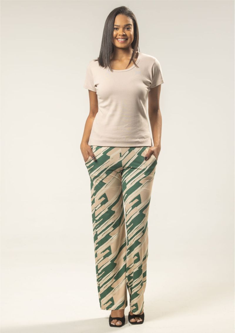 Calça pantalona estampada em Verde e Bege. A peça possui cós com elástico, bolsos frontais e bolsos traseiros. Soltinha ao corpo proporcionando muito mais conforto e leveza. Composição do Tecido: Confeccionado em 96% viscose e 4% elastano. medidas aproximadas: P:110cm comprimento x 80cm cintura x 60cm gancho x 100cm quadril. M:112cm comprimento x 86cm cintura x 62cm gancho x 106cm quadril. G:114cm comprimento x 92cm cintura x 64cm gancho x 112cm quadril. GG:116cm comprimento x 98cm cintura x 66cm gancho x 118cm quadril. XL:118cm comprimento x 104cm cintura x 68cm gancho x 124cm quadril. Todos os dados informados são aproximados, do peso às medidas. Atenção para as medidas. modelagem ampla.