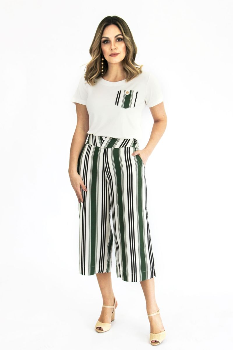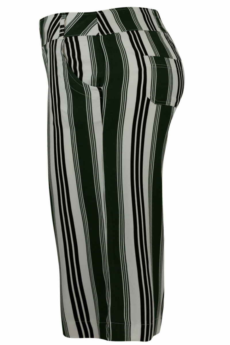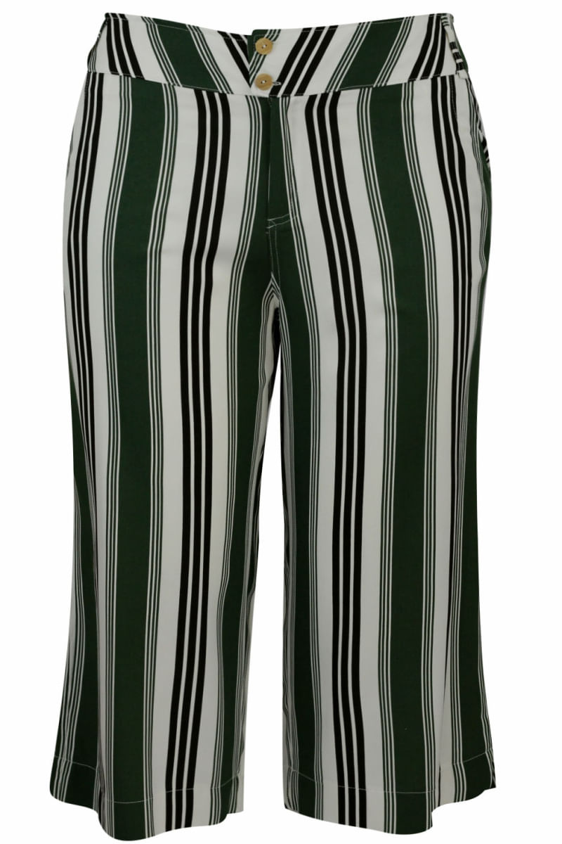Calça pantacourt listrada em Verde, Preto e Cru. Cós com cintura média-alta. Fechamento através de botões e zíper. Possui bolsos frontais e traseiros. Calça moderna, elegante e linda! Composição do Tecido: Confeccionado em 100% Viscose. Toque macio. Medidas Aproximadas: P: 74 x 88 x 67 x 104 cm (Altura, Cintura, Gancho e Quadril). M: 76 x 94 x 69 x 110 cm (Altura, Cintura, Gancho e Quadril). G: 78 x 100 x 71 x 116 cm (Altura, Cintura, Gancho e Quadril). GG: 80 x 106 x 73 x 122 cm (Altura, Cintura, Gancho e Quadril). XL: 82 x 112 x 75 x 128 cm (Altura, Cintura, Gancho e Quadril). Todos os dados informados são aproximados, do peso às medidas. ATENÇÃO PARA AS MEDIDAS, POIS NOSSA MODELAGEM É AMPLA!