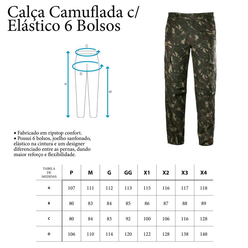 Fabricada em tecido Ripstop Comfort, que proporciona maior resistência, maciez, frescor e conforto. Possui 6 bolsos e ajuste com elástico na cintura.ESPECIFICAÇÕES:* Confeccionada em Rip Stop Comfort* Composição 67% algodão e 33% poliéster* Dois bolsos laterais com fechamento em velcro* Dois bolsos traseiros com fechamento em velcro* Dois bolsos laterais convencionais* Tecido amaciado para melhor conforto* Produto 100% Brasileiro - Fabricação Nacional