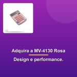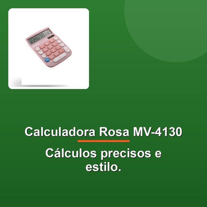 Calculadora Mesa Mv-4130 Rosa 12 DígitosA Calculadora de Mesa 12 Dígitos MV-4130 Rosa é a combinação perfeita de funcionalidade, design moderno e praticidade. Com um display LCD extra grande, ela oferece excelente visibilidade dos números e funções, sendo ideal para uso em escritórios, escolas ou no dia a dia. Sua cor rosa vibrante adiciona um toque de estilo e personalidade ao ambiente, tornando-a muito mais que uma simples ferramenta de cálculo.Equipada com funções avançadas como raiz quadrada e porcentagem, esta calculadora é projetada para atender às suas necessidades, desde operações básicas até cálculos mais complexos. Além disso, a função de correção dígito a dígito permite ajustes rápidos e precisos, garantindo maior eficiência e menos erros durante o uso. O teclado conta com números grandes e uma tecla de duplo zero, facilitando o manuseio e agilizando os cálculos, mesmo para quem utiliza frequentemente.Um dos grandes diferenciais da MV-4130 é sua dupla fonte de alimentação: energia solar e bateria. Durante o dia, ela aproveita a iluminação natural para funcionar, economizando bateria. Já em ambientes com pouca luz, a bateria assume completamente, garantindo que você nunca fique sem sua calculadora quando mais precisar. O visor LCD também conta com ícones que alertam sobre erros ou indicam o uso de funções especiais, oferecendo uma experiência intuitiva e prática.Com um tamanho compacto de 15 x 10,5 cm e pesando apenas 150 g, a calculadora é leve e fácil de transportar. Sua construção robusta e design ergonômico proporcionam durabilidade e conforto no uso diário. Seja para tarefas rápidas ou cálculos mais detalhados, a Calculadora de Mesa MV-4130 Rosa é a escolha certa para quem busca eficiência, estilo e tecnologia em um único produto.A Calculadora de Mesa 12 Dígitos MV-4130 Rosa é a combinação perfeita de funcionalidade, design moderno e praticidade. Com um display LCD extra grande, ela oferece excelente visibilidade dos números e funções, sendo ideal para uso em escritórios, escolas ou no dia a dia. Sua cor rosa vibrante adiciona um toque de estilo e personalidade ao ambiente, tornando-a muito mais que uma simples ferramenta de cálculo.Equipada com funções avançadas como raiz quadrada e porcentagem, esta calculadora é projetada para atender às suas necessidades, desde operações básicas até cálculos mais complexos. Além disso, a função de correção dígito a dígito permite ajustes rápidos e precisos, garantindo maior eficiência e menos erros durante o uso. O teclado conta com números grandes e uma tecla de duplo zero, facilitando o manuseio e agilizando os cálculos, mesmo para quem utiliza frequentemente.Um dos grandes diferenciais da MV-4130 é sua dupla fonte de alimentação: energia solar e bateria. Durante o dia, ela aproveita a iluminação natural para funcionar, economizando bateria. Já em ambientes com pouca luz, a bateria assume completamente, garantindo que você nunca fique sem sua calculadora quando mais precisar. O visor LCD também conta com ícones que alertam sobre erros ou indicam o uso de funções especiais, oferecendo uma experiência intuitiva e prática.Com um tamanho compacto de 15 x 10,5 cm e pesando apenas 150 g, a calculadora é leve e fácil de transportar. Sua construção robusta e design ergonômico proporcionam durabilidade e conforto no uso diário. Seja para tarefas rápidas ou cálculos mais detalhados, a Calculadora de Mesa MV-4130 Rosa é a escolha certa para quem busca eficiência, estilo e tecnologia em um único produto.