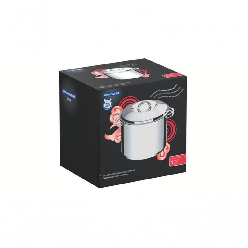 Caldeirão Tramontina 24cm Aço Inox SolarSe você deseja uma linha de panelas que atendam as suas necessidades na cozinha, a linha Solar é a escolha certa. O Caldeirão Tramontina em Aço Inox Fundo Triplo com Tampa e Alças 24 cm de diâmetro 9,6 L é fabricado para promover alta durabilidade e praticidade no dia a dia de quem ama estar na cozinha e preparar receitas cheias de sabor. Escolha os ingredientes e surpreenda-se. O Caldeirão da Tramontina é produzido em aço inox com fundo triplo (aço inox + alumínio + aço inox), proporcionando um cozimento uniforme e rápido. Sua parte interna de aço inox garante que não haja liberação de resíduos nos alimentos, mantendo-os saudáveis e com todo o seu sabor. Experimente algo que irá fazer a diferença na sua cozinha.Recomendações de Uso:Antes do uso: remova as eventuais etiquetas e lave-o com água quente, detergente e esponja macia. Outros tipos de produto como palha de aço, poderão riscar ou prejudicar o acabamento da peça.Modo de uso: ;não deixe o caldeirão vazio sobre uma fonte de calor. Use uma fonte de calor brando para evitar que o alimento grude no fundo do caldeirão. ;O fundo triplo distribui uniformemente o calor, não sendo necessário o fogo alto. E, além disso, economiza energia. ;Quando o caldeirão for utilizado no fogão a gás, a chama não deve ultrapassar a base do caldeirão. No caso de uso de chapa elétrica, a chapa deverá ter diâmetro igual ou inferior ao do caldeirão. Sempre dissolva o sal em água fervendo ou com os alimentos, mexendo os ingredientes no início do cozimento. ;Não aqueça o alimento colocando um caldeirão do mesmo diâmetro sobre o outro. Esse procedimento é perigoso, pois cria vácuo e impossibilita a retirada do mesmo. Se a tampa do caldeirão ficar presa pelo efeito do vácuo durante o resfriamento, basta puxar ou aquecer novamente até neutralizar o efeito do vácuo. As alças de inox aquecem durante o cozimento. Aconselhamos o uso de luvas durante o manuseio. Alguns alimentos que possuem amido, como massa e arroz, poderão deixar manchas na parte interna do caldeirão durante o cozimento. ;Deixe caldeirões quentes somente em superfícies resistentes ao calor. Pode ir ao forno em temperatura máxima de 260°C, podendo haver mudança na coloração.Após o uso: para remover facilmente as manchas, passe um pano umedecido com suco de limão ou vinagre. ;Evite deixar alimento no caldeirão por muito tempoo sal também pode provocar manchas. Para que o caldeirão de aço inox fique sempre bonito e com brilho, recomendamos que seja lavado somente com detergente e esponja. Depois da lavagem, sempre que possível, enxágue o caldeirão com água quente e seque-o imediatamente, para que ele mantenha o brilho , pois o cloro e as substâncias contidas na água podem deixar manchas no caldeirão. Não guarde a peça em locais úmidos. A umidade também provoca manchas. Para manter o brilho, ;a Tramontina desenvolveu uma pasta especial para polir e remover manchas nos produtos de aço inox, que está disponível nos principais pontos de venda (94537000).- Foto meramente ilustrativa.Informações Adicionais:- Totalmente feito de aço inox;- Tampa com saída de vapor e encaixe perfeito;- Pode ser lavado diariamente na máquina de lavar louças;- Design diferenciado e moderno, com acabamento em alto brilho;- Pode ir ao forno para gratinar ou finalizar pratos, na temperatura máxima de 260°C;- O fundo triplo (aço inox + alumínio + aço inox) distribui o calor uniformemente, proporcionando um cozimento mais rápido e uniforme, economizando energia e deixando os alimentos aquecidos por mais tempo.
