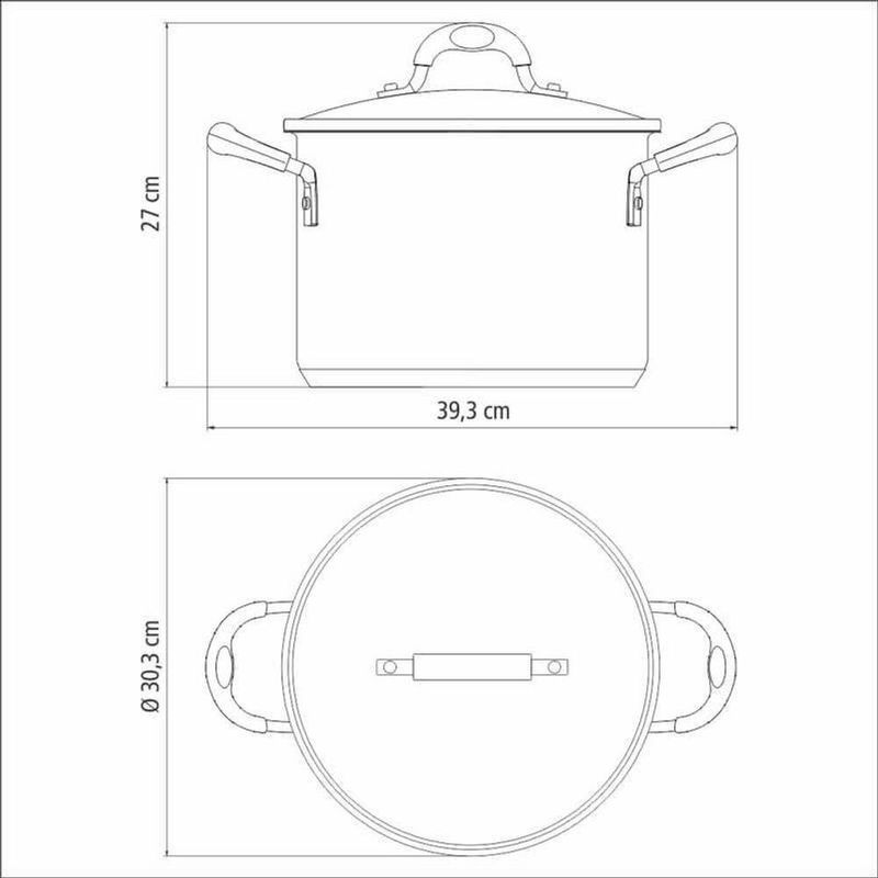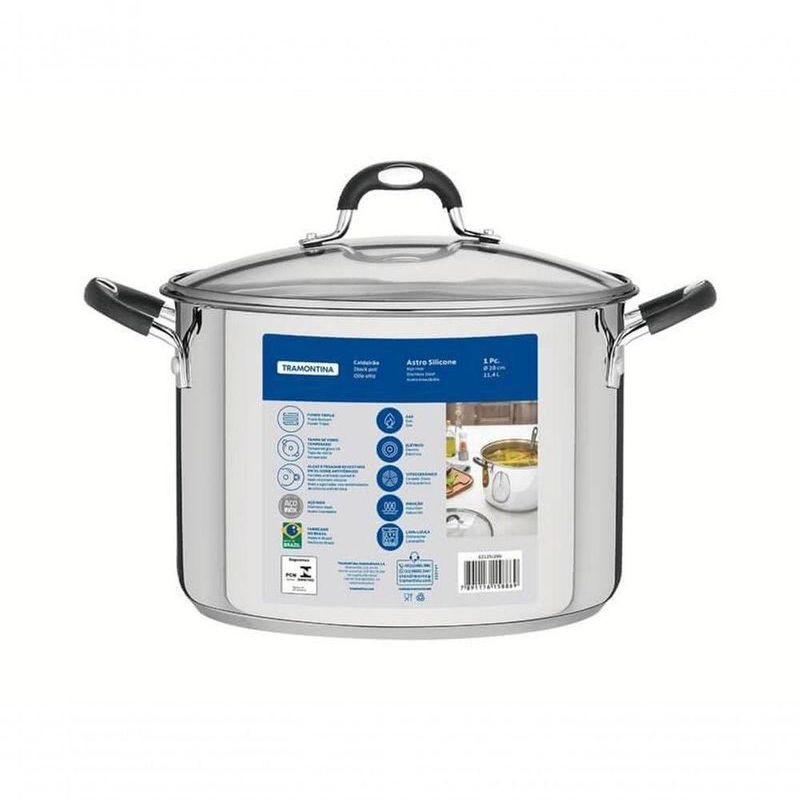 Caldeirão Tramontina Astro Silicone 28cm Em Aço Inox Com Tampa De VidroNão tem como não ficar com água na boca depois de utilizar o Caldeirão Tramontina Astro Silicone em Aço Inox com Fundo Triplo com Tampa de Vidro 28 cm 11,4 L. Como a peça é funda, ela é uma boa pedida para receitas que exigem bastante água no preparo, como sopas, caldos e feijoada. Desenvolvida em aço inox, o utensílio conta com pegador e alças antitérmicas oferecendo mais no manuseio e ainda possui a tampa de vidro possibilitando, assim, visualizar o cozimento dos alimentos. Também conta com fundo triplo, que é feito por duas camadas de aço inox envolvendo uma de alumínio (aço inox + alumínio + aço inox). Assim, distribuindo o calor uniformemente, proporcionando um cozimento mais rápido e deixando os alimentos aquecidos por mais tempo. A panela tem o design diferenciado e moderno, que só os produtos Tramontina possuem.Recomendações de Uso:- Antes de utilizar o produto, remover as eventuais etiquetas e lavar com água quente e detergente. - Use uma fonte de calor brando para evitar que o alimento grude no fundo da caçarola. O fundo triplo distribui uniformemente o calor, não sendo necessário o fogo alto. E, além disso, você economiza energia. - Quando a caçarola for utilizada no fogão a gás, a chama não deve ultrapassar a base da caçarola. No caso de uso de chapa elétrica, a chapa deverá ter diâmetro igual ou inferior ao da caçarola. - Sempre dissolva o sal em água fervendo ou com os alimentos, mexendo os ingredientes no início do cozimento. - Não aqueça o alimento colocando uma caçarola do mesmo diâmetro sobre a outra. Esse procedimento é perigoso, pois cria vácuo e impossibilita a retirada do mesma. - Se a tampa da caçarola de aço inox Tramontina ficar presa pelo efeito do vácuo durante o resfriamento, basta puxar ou aquecer novamente até neutralizar o efeito do vácuo. - As alças de inox aquecem durante o cozimento. Aconselhamos o uso de luvas durante o manuseio. - Alguns alimentos que possuem amido, como massa e arroz, poderão deixar manchas na parte interna da caçarola durante o cozimento. Para remover facilmente as manchas, passe um pano umedecido com suco de limão ou vinagre, ou use a Pasta para Polir e Remover Manchas Tramontina. - Evite deixar alimento na caçarola por muito tempo; o sal também pode provocar manchas.Para que a caçarola de aço inox fique sempre bonita e com brilho, recomendamos que seja lavada somente com detergente e esponja. A Tramontina desenvolveu uma pasta especial para polir e remover manchas nos produtos de aço inoxidável, que está disponível nos principais pontos de venda. - Depois da lavagem, sempre que possível, enxágue a caçarola com água quente e seque-a imediatamente, para que ela mantenha o brilho , pois o cloro e as substâncias contidas na água podem deixar manchas na caçarola. - Não deixe a caçarola vazia sobre uma fonte de calor. Deixe caçarolas quentes somente em superfícies resistentes ao calor.Informações Adicionais:- Totalmente feita em aço inox, por isso não solta nenhum resíduo nos alimentos, mantendo-os saudáveis. - Altamente durável, mantém as características , preservando a beleza, a higiene e a durabilidade do material. - O fundo triplo (aço inox + alumínio + aço inox) distribui o calor uniformemente, proporcionando um cozimento mais rápido e uniforme, economizando energia e deixando os alimentos aquecidos por mais tempo.Possui design diferenciado e moderno, com acabamento em alto brilho. - Desenho limpo e sem cantos torna a limpeza mais fácil. - Cabos e alças com protetor de chamas, evitando que queimem quando a chama não estiver centralizada no fundo da panela. - Tampa de vidro com saída de vapor e encaixe perfeito. - Pode ser lavada diariamente na máquina de lavar louças.- Pode ser utilizada nos fogões: gás, elétrico, vitrocerâmico e indução.- Material: aço inox com tampa de vidro- Alças e pegador antitérmico.- Produto com fundo triplo (aço inox + alumínio + aço inox).- Foto meramente ilustrativa.
