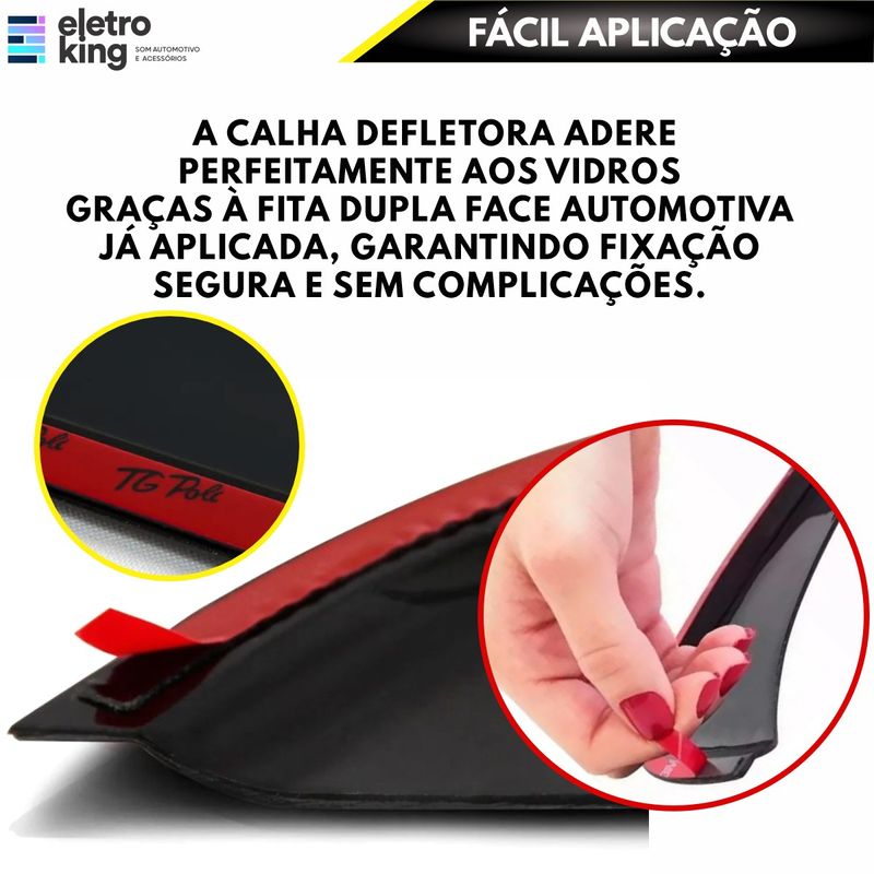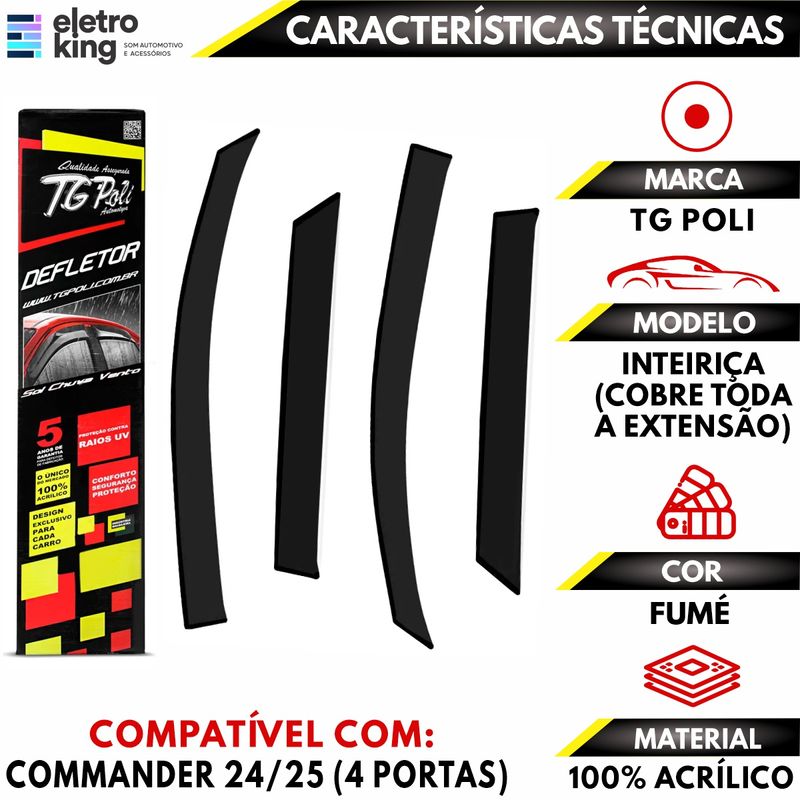 Calha Defletor De Chuva Inteiriça Commander 24/25 (4 portas) A Calha Defletora de Chuva Inteiriça garante mais conforto e praticidade no dia a dia, permitindo manter os vidros levemente abertos mesmo em dias de chuva, sem entrada de água. Além disso, contribui para reduzir o calor interno, melhorar a circulação de ar, diminuir o embaçamento dos vidros e ainda valorizar o visual do veículo com acabamento moderno e discreto. Especificações Técnicas: • Marca: TG Poli • Compatibilidade: Commander 2024/2025 (4 portas). • Modelo: Inteiriça (cobre toda a extensão do vidro). • Quantidade de peças: Jogo completo para as 4 portas. • Material: 100% Acrílico automotivo de alta resistência. • Cor: Fumê. • Instalação: Simples, com fita dupla face automotiva já aplicada. • Função: Proteção contra chuva, vento e redução de calor interno. • Design: Moderno, discreto e com perfeito encaixe sob medida. • Acabamento: Resistente a raios UV, não desbota com o tempo. Conteúdo da Embalagem: • 01 Jogo de Calhas Defletor De Chuva Inteiriça • 01 Primer (anti-aderente) Importante: • Garantia de 90 Dias. • Valor Unitário.