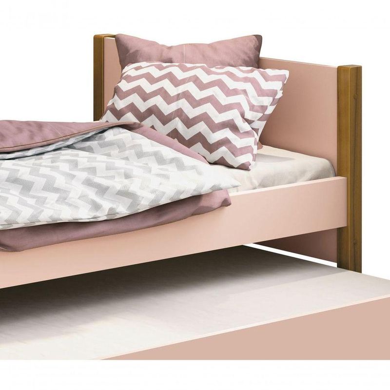 Cama Babá Solteiro Com Auxiliar Simba Rosa Fosco Com Madeira - MoveisaquiCom traços e linhas retas, a Cama com Auxiliar Simba - MoveisAqui, agrega a contraposição do MDF com a madeira maciça, trazendo estilo a decoração do quarto das crianças, com a cama auxiliar inclusa é ideal para conciliar de forma confortavél duas crianças.Dimensões do Produto Montado:Altura: 73 cmLargura: 203 cmProfundidade: 96 cmObservações:- Recomendação do Colchão: 188×88 espessura livre (colchão não incluso);- Recomendação do Colchão auxiliar: 188×88x12 (colchão não incluso);- Com rodízios na cama auxiliar;- Pintura ultravioleta com acabamento fosco;- Pés em pinus na cor Madeira.