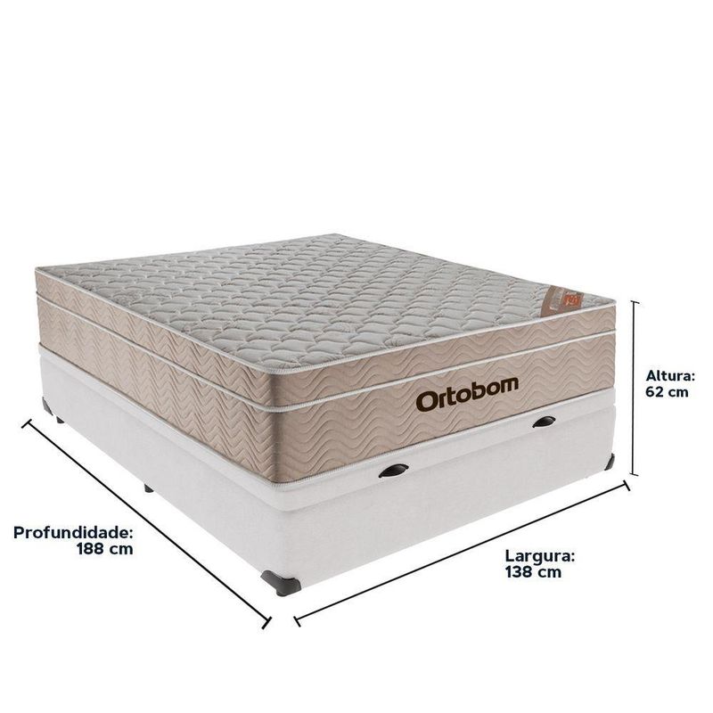 Cama Box Baú Branco E Colchão Airtech Spring Casal OrtobomBem-vindo(a) ao nosso catálogo!Apresentamos a você uma descrição completa sobre esse produto:O AirTech é um colchão de molas ensacadas que oferece uma excelente adaptação ao corpo, proporcionando um sono confortável e revitalizante. Com sua espuma D26 Pró, o colchão oferece suporte ideal e durabilidade a longo prazo. O Pillow Euro proporciona uma sensação de maciez e aconchego, enquanto a lateral em suede dá um toque de elegância ao produto.Colchão:Modelo: Airtech ;Marca: Ortobom;Tamanho: Casal;Dimensões: 138x188x25cm; (largura x comprimento x altura)Conforto: Molas Ensacadas, Espuma D26 Pró, Pillow Euro;Proteções: , , , ;Possui: Lateral em Suede;Peso máximo recomendado: até 120Kg (por pessoa);Garantia: 03 meses;Suporte e Altura: Este colchão suporta até 120kg, tornando-o ideal para pessoas de todos os tamanhos e formas. Com uma altura de 25cm, o AirTech oferece uma sensação de conforto e , permitindo que você descanse profundamente e acorde revigorado pela manhã.Qualidade Ortobom: O AirTech é produzido pela renomada marca Ortobom, conhecida por sua expertise em tecnologia do sono. Com anos de experiência no mercado, a Ortobom é reconhecida por oferecer produtos inovadores e de alta qualidade, que atendem às necessidades dos clientes mais exigentes.Base Box com Baú:Marca: KazaMix;Cor do Baú: Branco;Revestimento da Cama: Material Sintético;Material dos pés: Madeira;Estrutura: Madeira;Abertura: Pistão a gás;Peso máximo recomendado: até 150kg de cada lado;Altura do Baú: 32cm;Altura dos pés: 5cm;Altura total: 37cm;Garantia: 03 meses;Selo Ecologicamente Correto.Invista no seu sono e experimente o conforto e a qualidade!Atenção: Antes de finalizar sua compra, certifique-se de que as dimensões do produto sejam adequadas para serem transportadas pelos elevadores, portas, escadas e corredores de sua residência. Ressaltamos que não nos responsabilizamos pelo do produto por meios específicos, como escadas, guinchos ou içamentos.