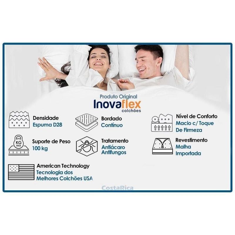 Cama Box Baú Casal + Colchão Ortopédico Inovaflex Comfort PremiumCama Box Baú Casal + Colchão Ortopédico Inovaflex Comfort PremiumAbaixo segue os produtos que fazem parte desse KIT:CAMA BOX BAÚ CASAL COSTA RICA CORANO WHITE 138X188X35Marca: A Costa RicaDimensões(Cm): Cama Box Baú Corano WhiteComprimento(Profundidade): 188 cmLargura: 138 cmAltura: 39 cm Profundidade interna do Baú: - 23 cm Abertura do Box Baú: - Abertura do Box Baú Frontal Características Gerais da Cama Box: - Articulação em Aço, Amortecedores de Articulação Forração Revestimento: - Courano, Antiderrapante, Poliéster Cor do Revestimento Cama Box: - Branco Tipo de bordado do tecido da lateral Cama Box: - Matelassê Suporte de Peso da Cama Box: - 150 Kg Sobre os Pés para Cama Box: - Pés Fixos Madeira/ABS Altura das Camas Box com os pés: - 42 cm altura Tempo de Garantia da Cama Box: - 3 meses Certificação de Qualidade: - Selo Ecologicamente Correto, Garantia de Qualidade Costa Rica, Qualidade Compulsória INMETRO Nossa Avaliação da Cama Box: - Qualidade Muito BoaCOLCHÃO CASAL ORTOPÉDICO INOVAFLEX COMFORT 138X188X18Marca: InovaflexDimensões(Cm): Colchão Ortopédico ComfortComprimento(Profundidade): 188 cmLargura: 138 cmAltura: 18 cm Suporte de Peso: - 110 kg Espuma de Estofamento: - Alta Qualidade, D28 Nível de Firmeza do Colchão: - Macio c/ Firmeza Estrutura Bloco de Espuma: - EPS Tipo de Espuma: - Espuma de Poliuretano de Alta Qualidade Tipo de Colchão: - Anatômico Benefícios Extras de Colchão: - Ecologicamente Correto, Tecnologia Americana Tecido com Tratamento: - Antiácaro e Antifungo Características do Tecido: - Malha de Alta Qualidade Tipo do Bordado do Tecido: - Contínuo Tecido da Faixa Lateral: - Suede Modo de Utilização: - Double Side Certificação de Qualidade: - INMETRO, Qualidade Costa Rica Tempo de Garantia: - 6 mesesImagens Meramente Ilustrativas.Não nos responsabilizamos pela montagem/instalação dos produtos.Todas as informações divulgadas são de responsabilidade exclusiva do fabricante/fornecedor. Tempo de Garantia do Colchão: 6 meses | Certificação de Qualidade do Colchão: INMETRO | Garantia Complementar de Fábrica após Prazo Legal?: Garantia de Fábrica | Com pillow top: Não | É eco-friendly: Sim | Está embalado a vácuo: Não | Com função de massagem: Não | Possui Memory Foam (Espuma Viscoelástica): Não | É hipoalergênica: Sim | É antiácaros: Sim | É ortopédico: Sim | Este Produto Inclui Travesseiro: Não | Com alta densidade: Sim | Este Colchão é Magnético: Não | É colchão na caixa: Não | É Antifungos?: Sim | Com aromaterapia: Não | Tipo de Base: Baú | Requer montagem: Sim | Inclui manual de montagem: Sim | Com baú: Sim | Com memoria: Não | É inteligente: Não | É antihongos: Sim | É produto personalizado: Não | Desenho do tecido: N/A | Com moldura perimetral: Não | Firmeza: Média | Número de registro/certificação INMETRO: N/A | Tipo de Produto: N/A | Estrutura do Colchão: Espuma | Tipo do Colchão: Padrão | Com rodas?: Não | É kit?: Sim | É resistente à água: Não | É Lavável?: Não | Fonte do produto: N/A | Código universal de produto (GTIN): 7898052997064 | Descrição do Tamanho: 1.00x:1.00x1.00 cm | Dimensões: 1.00 cm x 1.00 cm x 1.00 cm | Estado de Origem: RJ | País de origem: Nacional | Peso Produto Com Embalagem (Kg): 81.72 | Material para Filtro: N/I | Condição do Item: Novo | Link Site: https://www.costaricacolchoes.com.br/produtos/51343S3122/ | Numeral: 0 | Não se Aplica: N/A | Não Possui: Não | Linha/Modelo: Inovaflex | Cor Cnova: Blush | Cor Meli: Ciano | Categoria Trilha: Conjunto Box Baú + Colchão> Cama Box Baú+Colchão Ortopédico | Categoria - Sub: Cama Box Baú+Colchão Ortopédico | Categoria - Pai: Conjunto Box Baú + Colchão | Comprimento Embalagem: 1.00 | Largura Embalagem: 1.00 | Altura Embalagem: 1.00 | Peso: 81.72 Kg | Kit: 1 | Peso Real Kg: 81.72 | Peso Cubado: 345.00 | Volumes: 2 | M3: 1.38 | Comprimento/Profundidade: 1 cm | Largura: 1 cm | Altura: 1 cm | Tamanho Montado: Larg:1.00 x Comp/Prof:1.00 x Alt: 1.00 | Comprimento/Profundidade Montado: 1.00 | Largura Montado: 1.00 | Altura Montado: 1.00 | Tamanho Cama Colchão: Casal | Marca: Inovaflex | Fabricante: Inovaflex | Linha: Inovaflex