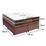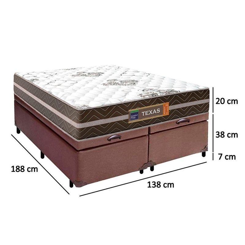 Cama Box Baú Casal Bipartido Sintético + Colchão Molas Ensacadas Texas Colchões 138cm Suporta Até 120kg Por PessoaA Cama Box Baú Casal Sintético + Colchão Molas Ensacadas Texas 138x188x67cmÉ uma combinação que oferece uma solução completa, agilidade e praticidade na aquisição da sua cama. O Colchão Casal Texas Molas Ensacadas foi criado pensando em você. Possui molas ensacadas em sua composição, o que proporciona um conforto único. A capacidade de suporte é de até 120kg por pessoa, garantindo conforto durante o sono, além de promover um melhor apoio e qualidade de vida.A Cama Box é a opção ideal para maior aproveitamento do quarto, pois oferece espaço extra e praticidade. Produto de alta durabilidade, resistente e excelente qualidade em acabamento, totalmente em suede, o que lhe confere elegância e sofisticação em qualquer ambiente.Características do Colchão:- Marca: Colchões- Marrom/Branco- Espuma: D26- Modelo: Texas- Tamanho: Casal- Tipo de Molas: Ensacadas- Revestimento Superior: Poliéster- Revestimento Lateral: Poliéster- Capacidade: 120kg por pessoas- Interior: Molas ensacadas, com espuma D26- Dimensões do colchão (largura x comprimento x altura): 138x188x22cmCaracterísticas do Box:- Estrutura Interna: Estrutura em madeira 100% de Reflorestamento- Marca: Cama- Estrutura Externa: Sintético- Tratamento : Sim- Tratamento : Sim- Saída de Ventilação: Não- Ortopédico: Não- Tecido Antiderrapante: Não- Suporta até (kg): 150 Kg- Necessita Montagem: Não- Dimensões do box (largura x comprimento x altura): 138x188x45cmDimensões do Produto:- Altura (Box + Colchão): 67cm- Largura: 138cm- Comprimento: 188cm- Altura dos Pés: 7cm*As cores do produto podem variar de acordo com o monitor, a iluminação do ambiente e a sua percepção visual.**Confira as dimensões do produto e certifique-se de que passará normalmente por supostos elevadores, portas, escadas e/ou corredores de sua residência.**Verifique nossas politicas internas para que não haja nenhuma dúvida no processo de ao finalizar a compra, pois não fazemos a montagem e desmontagem do produto e/ou portas e janelas, pela escada ou içamento pelo lado de fora do prédio.*