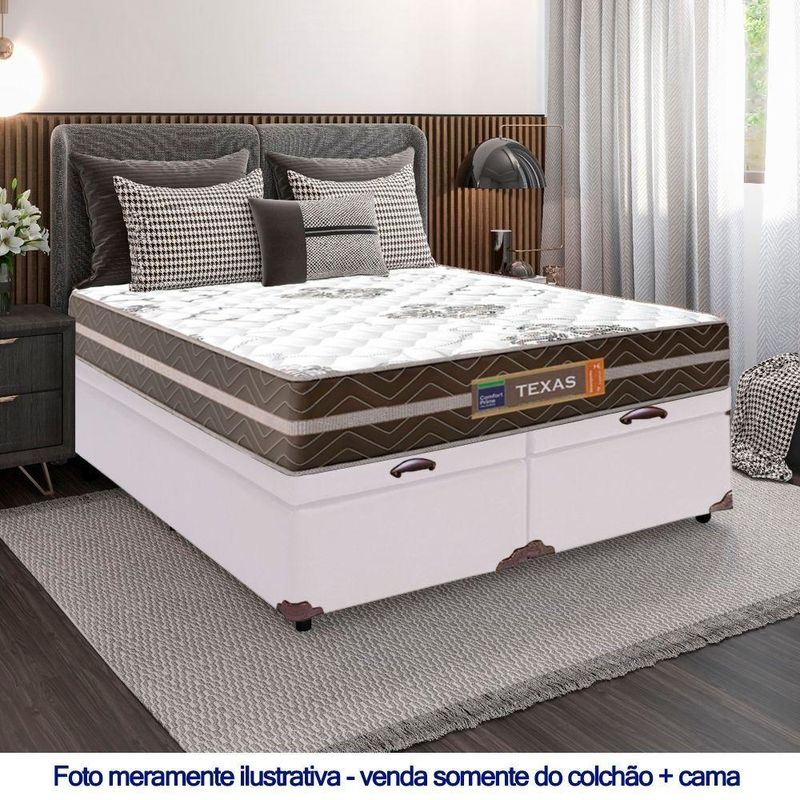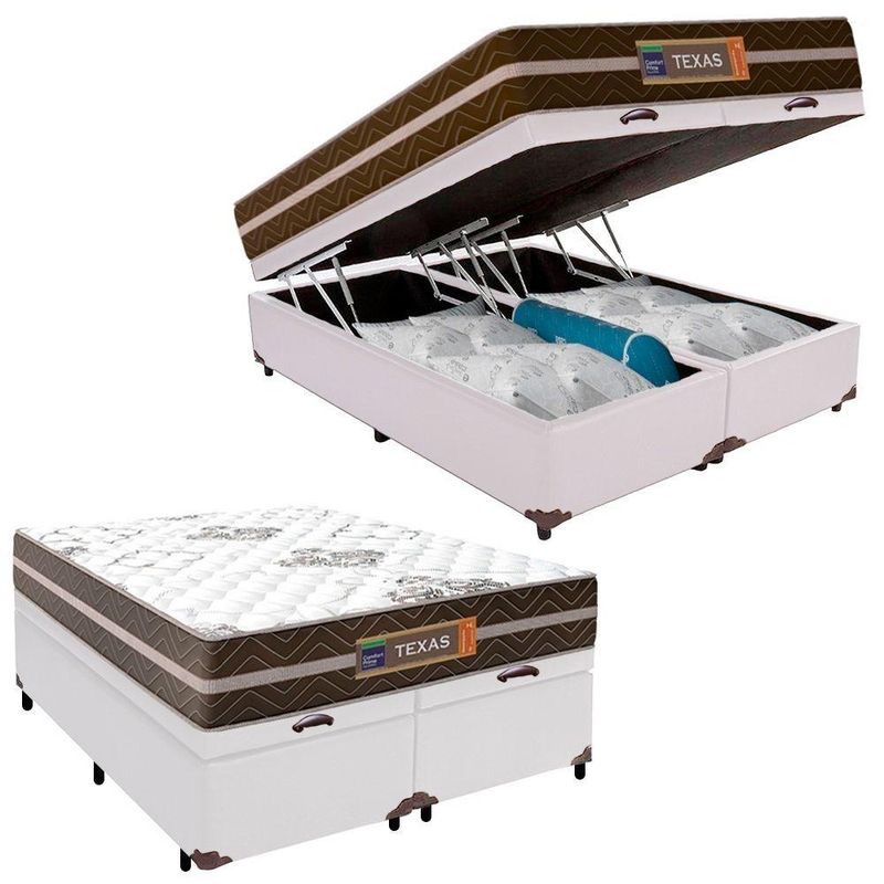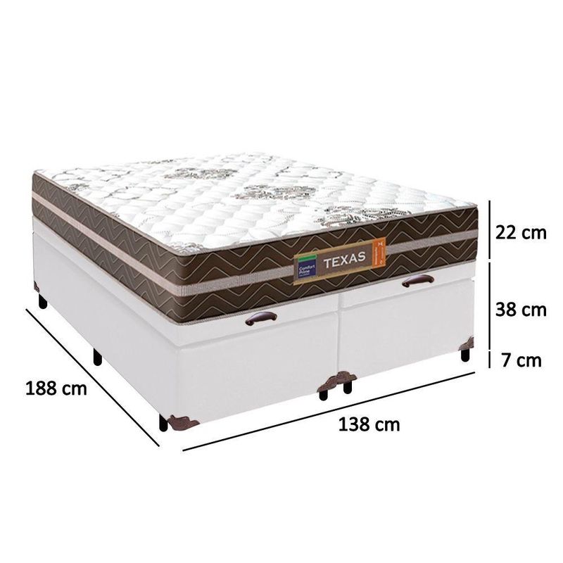 Cama Box Baú Casal Bipartido Sintético + Colchão Molas Ensacadas Texas Colchões 138x188x67cm BrancoA Cama Box Baú Casal Sintético + Colchão Molas Ensacadas Texas 138x188x67cmÉ uma combinação que oferece uma solução completa, agilidade e praticidade na aquisição da sua cama. O Colchão Casal Texas Molas Ensacadas foi criado pensando em você. Possui molas ensacadas em sua composição, o que proporciona um conforto único. A capacidade de suporte é de até 120kg por pessoa, garantindo conforto durante o sono, além de promover um melhor apoio e qualidade de vida.A Cama Box é a opção ideal para maior aproveitamento do quarto, pois oferece espaço extra e praticidade. Produto de alta durabilidade, resistente e excelente qualidade em acabamento, totalmente em suede, o que lhe confere elegância e sofisticação em qualquer ambiente.Características do Colchão:- Marca: Colchões- Marrom/Branco- Espuma: D26- Modelo: Texas- Tamanho: Casal- Tipo de Molas: Ensacadas- Revestimento Superior: Poliéster- Revestimento Lateral: Poliéster- Capacidade: 120kg por pessoas- Interior: Molas ensacadas, com espuma D26- Dimensões do colchão (largura x comprimento x altura): 138x188x22cmCaracterísticas do Box:- Estrutura Interna: Estrutura em madeira 100% de Reflorestamento- Marca: Cama- Estrutura Externa: Sintético- Tratamento : Sim- Tratamento : Sim- Saída de Ventilação: Não- Ortopédico: Não- Tecido Antiderrapante: Não- Suporta até (kg): 150 Kg- Necessita Montagem: Não- Dimensões do box (largura x comprimento x altura): 138x188x45cmDimensões do Produto:- Altura (Box + Colchão): 67cm- Largura: 138cm- Comprimento: 188cm- Altura dos Pés: 7cm*As cores do produto podem variar de acordo com o monitor, a iluminação do ambiente e a sua percepção visual.**Confira as dimensões do produto e certifique-se de que passará normalmente por supostos elevadores, portas, escadas e/ou corredores de sua residência.**Verifique nossas politicas internas para que não haja nenhuma dúvida no processo de ao finalizar a compra, pois não fazemos a montagem e desmontagem do produto e/ou portas e janelas, pela escada ou içamento pelo lado de fora do prédio.*