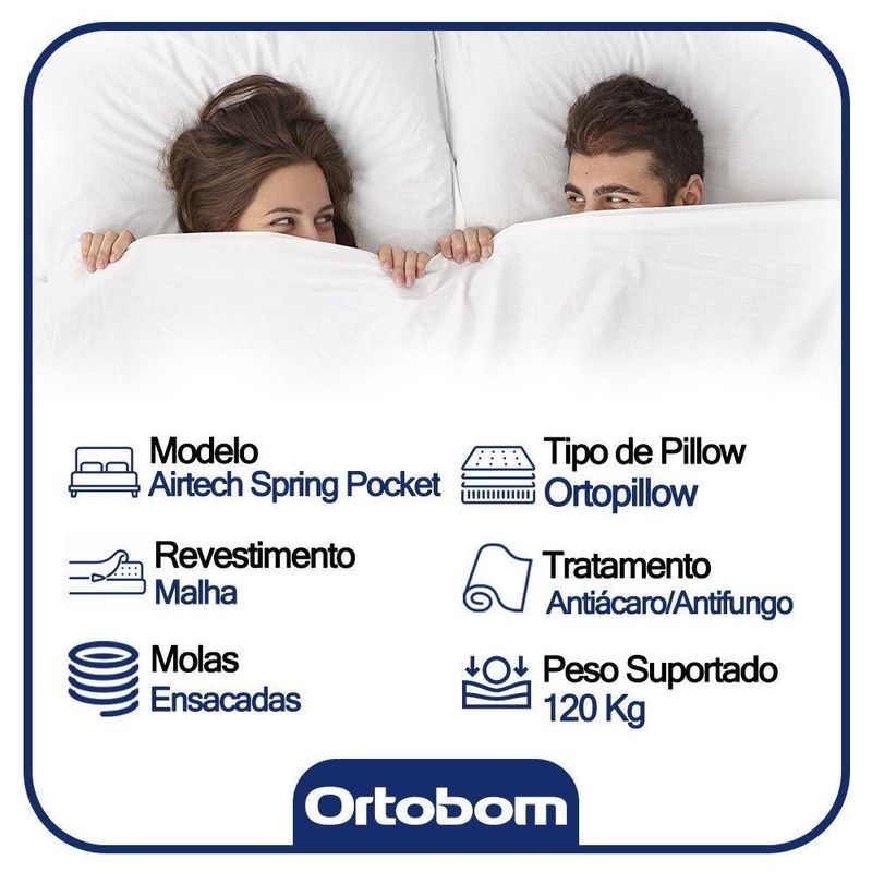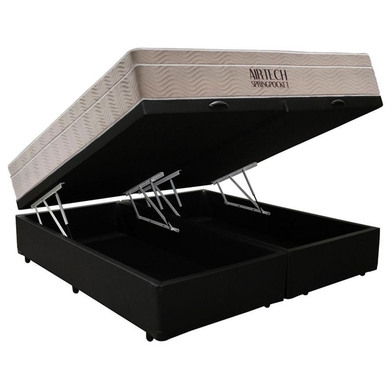 Cama Box Baú Casal Bipartido Sintético + Colchão Ortobom Airtech Molas Ensacadas 65x138x188 PretoCama Box Baú Casal Sintético Bipartido Preto + Colchão Ortobom Airtech Molas Ensacadas 65x138x188O Colchão Casal Ortobom Airtech Molas Ensacadas oferece uma experiência de sono excepcionalmente confortável e suporte personalizado para noites de descanso revitalizante. Contando com molas ensacadas e espuma, ele é a opção perfeita para acomodar bem seu corpo e deixar você bem aconchegado, levando maior bem-estar às suas horas de descanso.A Base Box é confeccionada com estrutura de madeira 100% reflorestada com tratamentos anticupim e , proporcionando alta durabilidade e resistência do produto. Possui excelente acabamento dando um ar de sofisticação e requinte.Especificações Técnicas Colchão:Marca: OrtobomModelo: Iso Dupla FaceProteções: - Pillow: Pillow Top EuropeuTecido de Revestimento: Bordado MatelassêForração Revestimento: Malha ImportadaFaixa Lateral: Em NobuckRevestimento Inferior: AntiderrapanteModo de Utilização: One Side No TurnDimensões do Colchão (altura x largura x comnto) Casal: 25x138x188cmEspecificações Técnicas Base Box Baú:Cor: PretoMaterial: Madeira tratadaProteções: Anticupim - Peso máximo recomendado: até 150Kg (por pessoa)Revestimento: material (tecido) sintéticoAltura da base: 28cmAltura dos pés: 12cmDimensões do produto:Altura Total (base + colchão): 65cmLargura: 138cm (Duas bases box baú de 69cm cada uma)Comnto: 188cm*As cores do produto podem variar de acordo com o monitor, a iluminação do ambiente e a sua percepção visual.*Confira as dimensões do produto e certifique-se de que passará normalmente por supostos elevadores, portas, escadas e/ou corredores de sua residência.*Verifique nossas politicas internas para que não haja nenhuma dúvida no processo de ao finalizar a compra, pois não fazemos a montagem e desmontagem do produto e não nos responsabilizamos por subir escadas, corredores e elevadores ou por içamento pelo lado de fora do prédio.