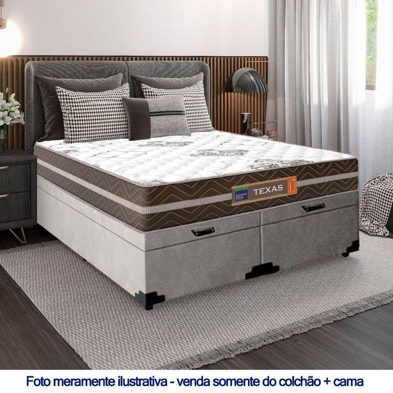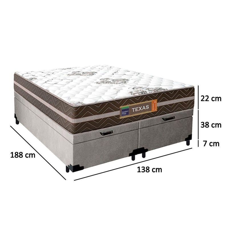 Cama Box Baú Casal Bipartido Suede + Colchão Molas Ensacadas Texas Colchões 138cm - Suporta Até 120kg Por Pessoa CA Cama Box Baú Casal Suede + Colchão Molas Ensacadas Texas 138x188x67cmÉ uma combinação que oferece uma solução completa, agilidade e praticidade na aquisição da sua cama. O Colchão Casal Texas Molas Ensacadas foi criado pensando em você. Possui molas ensacadas em sua composição, o que proporciona um conforto único. A capacidade de suporte é de até 120kg por pessoa, garantindo conforto durante o sono, além de promover um melhor apoio e qualidade de vida.A Cama Box é a opção ideal para maior aproveitamento do quarto, pois oferece espaço extra e praticidade. Produto de alta durabilidade, resistente e excelente qualidade em acabamento, totalmente em suede, o que lhe confere elegância e sofisticação em qualquer ambiente.Características do Colchão:- Marca: Colchões- Marrom/Branco- Espuma: D26- Modelo: Texas- Tamanho: Casal- Tipo de Molas: Ensacadas- Revestimento Superior: Poliéster- Revestimento Lateral: Poliéster- Capacidade: 120kg por pessoas- Interior: Molas ensacadas, com espuma D26- Dimensões do colchão (largura x comprimento x altura): 138x188x22cmCaracterísticas do Box:- Estrutura Interna: Estrutura em madeira 100% de Reflorestamento- Marca: Cama- Estrutura Externa: Suede- Tratamento : Sim- Tratamento : Sim- Saída de Ventilação: Não- Ortopédico: Não- Tecido Antiderrapante: Não- Suporta até (kg): 150 Kg- Necessita Montagem: Não- Dimensões do box (largura x comprimento x altura): 138x188x44cmDimensões do Produto:- Altura (Box + Colchão): 67cm- Largura: 138cm- Comprimento: 188cm- Altura dos Pés: 7cm*As cores do produto podem variar de acordo com o monitor, a iluminação do ambiente e a sua percepção visual.**Confira as dimensões do produto e certifique-se de que passará normalmente por supostos elevadores, portas, escadas e/ou corredores de sua residência.**Verifique nossas politicas internas para que não haja nenhuma dúvida no processo de ao finalizar a compra, pois não fazemos a montagem e desmontagem do produto e/ou portas e janelas, pela escada ou içamento pelo lado de fora do prédio.*