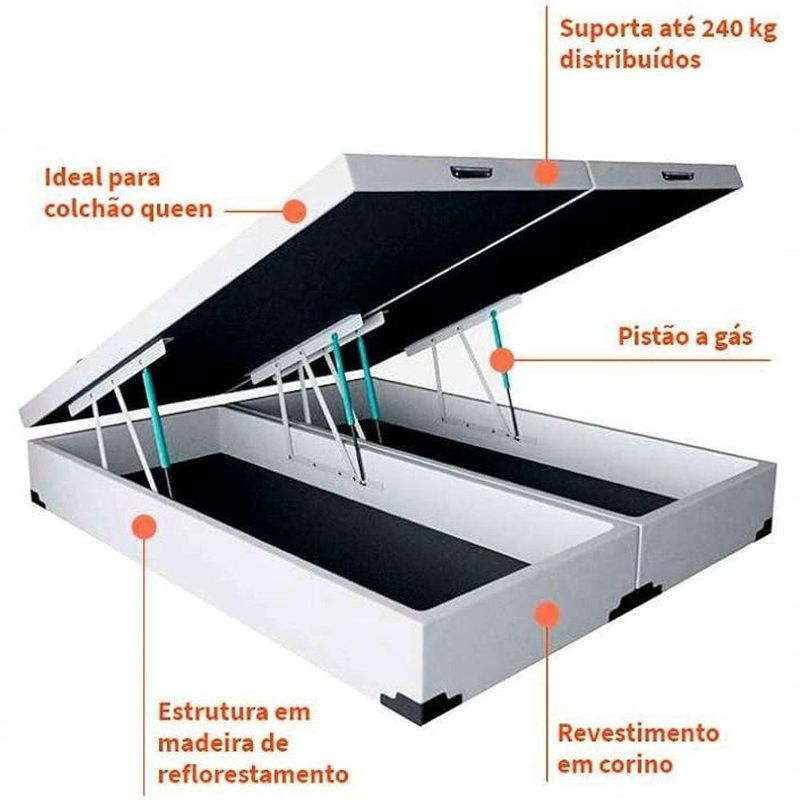 Cama Box Baú Casal Bipartido Suede Branca 138x188Descrição do Produto:Baú Casal Bipartido ? Espaço, Conforto e Praticidade para Seu Quarto!Transforme o seu quarto com o Baú Casal Bipartido, a solução perfeita para quem busca organização e otimização de espaço sem abrir mão do conforto! Com estrutura reforçada e sistema bipartido, ele facilita o transporte, a montagem e garante mais resistência e durabilidade.Destaques do Produto:Sistema Bipartido: Ideal para passar por corredores e portas estreitas, facilitando o transporte e a instalação.Amplo Espaço Interno: Armazene roupas de cama, edredons, malas e muito mais.Estrutura Reforçada: Madeira de qualidade e base resistente que suporta o uso diário.Tampa com Pistão a Gás: Abertura suave e segura, com acesso prático ao interior.Acabamento Premium: Design moderno que combina com qualquer decoração.Medidas Aproximadas:Comprimento: 1,88mLargura: 1,38mAltura: 0,40mCompatível com colchões padrão casal 138x188cmPerfeito para quem mora em apartamento ou precisa de uma cama com função dupla: dormir bem e organizar melhor. O baú casal bipartido é a escolha inteligente para otimizar espaços pequenos!