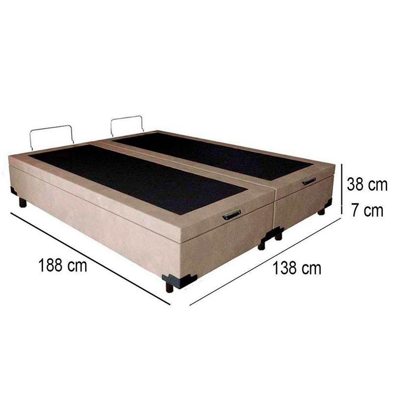 Cama Box Baú Casal Bipartido Suede Mega Cama Bege 138x188x45cmCama Box Baú Casal Bipartido Suede Mega Cama Bege 138x188x45cmNossas Bases Box Baú são produzidas com materiais de alta qualidade, garantindo praticidade, conforto, resistência e durabilidade. Além disso, este modelo conta com baú bipartido, facilitando o transporte, a entrada em ambientes menores e o manuseio no dia a dia, sem abrir mão de amplo espaço interno para organização.É a base ideal para oferecer conforto, segurança e sustentação ao seu colchão, além de deixar seu quarto moderno e sofisticado.As cores do produto podem variar conforme o monitor, iluminação e percepção visual.Confira as dimensões antes da compra para garantir que o produto passará por elevadores, portas, escadas e corredores.Características do Baú:Tipo: Baú bipartidoEstrutura Interna: Madeira e estrutura articulada de ferro com pistão a gásEstrutura Externa: Revestimento em tecido suedeMarca: Mega CamaTratamento Antiácaro: SimTratamento Antialérgico: SimSaída de Ventilação: SimSuporta até: 150 kgNecessita montagem: NãoAmbiente: QuartoContém 02 puxadores para facilitar a aberturaContém 01 arco traseiro para evitar que o colchão escorregueAltura: 38 cmLargura: 138 cmProfundidade: 188 cmPossui pés: SimAltura dos pés: 7 cm As cores do produto podem variar conforme monitor, iluminação e percepção visual.Confira as dimensões antes da compra para garantir a passagem por elevadores, portas, escadas e corredores.Não realizamos montagem, desmontagem ou transporte por escadas, corredores, elevadores ou içamento externo.