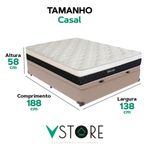 Cama Box Baú Casal E Colchão Dallas Molas V-store BegeA tecnologia que a sua casa merece está na V-Store!O Conjunto Colchão Dallas e Base Box Baú Bravus combina conforto e praticidade. O colchão, com molas ensacadas, espuma D33, Euro Pillow e tecnologia EPS, oferece suporte ideal, conforto térmico, maior durabilidade e resistência. A base box baú, com estrutura reforçada e acabamento elegante, proporciona amplo espaço para armazenamento e organização do dormitório. Perfeito para quem busca qualidade, funcionalidade e sofisticação.Adquira agora e transforme suas noites de sono!Característica Do Colchão:Modelo: DallasMarca: V-StoreTamanho CasalDimensões: 138x20x188 (Largura x Altura x Comprimento)Conforto: MédioSistema: Molas EnsacadasPillow: Euro PillowPeso Máximo recomendado: 150 kg (Por pessoa)Proteções: Antiácaro, antialérgico, antifungo, antimofoGarantia: 12 Meses (Espuma) / 10 anos ( Conjunto de Molas Ensacadas)Característica Da Base:Marca: V-StoreModelo: BravusTamanho CasalDimensões: 138x44x188 (Largura x Altura x Comprimento)Estrutura: MadeiraPeso máximo recomendado: 150 kg (Por Pessoa)Altura do Box: 38 cmAltura dos Pés: 6 cmAltura total: 44 cmGarantia: 12 Meses (Estrutura) / 3 meses (Tecido)Selo Ecologicamente CorretoAtenção:- Antes de finalizar sua compra, recomendamos que verifique se as dimensões do produto são adequadas para serem transportadas pelos elevadores, portas, escadas e corredores de sua residência. Ressaltamos que não nos responsabilizamos pelo transporte do produto por meios específicos, como escadas, guinchos ou içamentos.- É possível que hajam leves variações de cor de acordo com o dispositivo que está sendo utilizado como smartphones, computadores, monitores e outros.