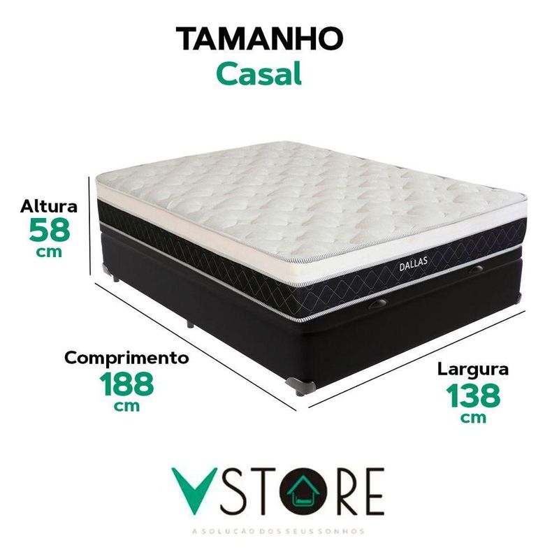 Cama Box Baú Casal Preto E Colchão Dallas Molas VstoreA tecnologia que a sua casa merece está na V-Store!O Conjunto Colchão Dallas e Base Box Baú Bravus combina conforto e praticidade. O colchão, com molas ensacadas, espuma D33, Euro Pillow e tecnologia EPS, oferece suporte ideal, conforto térmico, maior durabilidade e resistência. A base box baú, com estrutura reforçada e acabamento elegante, proporciona amplo espaço para armazenamento e organização do dormitório. Perfeito para quem busca qualidade, funcionalidade e sofisticação.Adquira agora e transforme suas noites de sono!Característica Do Colchão:Modelo: DallasMarca: V-StoreTamanho CasalDimensões: 138x20x188 (Largura x Altura x Comprimento)Conforto: MédioSistema: Molas EnsacadasPillow: Euro PillowPeso Máximo recomendado: 150 kg (Por pessoa)Proteções: Antiácaro, antialérgico, antifungo, antimofoGarantia: 12 Meses (Espuma) / 10 anos ( Conjunto de Molas Ensacadas)Característica Da Base:Marca: V-StoreModelo: BravusCor do Box: PretoTamanho CasalDimensões: 138x44x188 (Largura x Altura x Comprimento)Estrutura: MadeiraPeso máximo recomendado: 150 kg (Por Pessoa)Altura do Box: 38 cmAltura dos Pés: 6 cmAltura total: 44 cmGarantia: 12 Meses (Estrutura) / 3 meses (Tecido)Selo Ecologicamente CorretoAtenção:- Antes de finalizar sua compra, recomendamos que verifique se as dimensões do produto são adequadas para serem transportadas pelos elevadores, portas, escadas e corredores de sua residência. Ressaltamos que não nos responsabilizamos pelo transporte do produto por meios específicos, como escadas, guinchos ou içamentos.- É possível que hajam leves variações de cor de acordo com o dispositivo que está sendo utilizado como smartphones, computadores, monitores e outros.