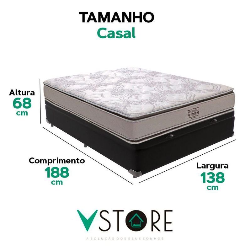 Cama Box Baú Casal Preto E Colchão Four Season Molas VstoreA tecnologia que a sua casa merece está na V-Store!O Conjunto Colchão Four Seasons e Base Box Baú Bravus é a solução ideal para quem busca conforto, durabilidade e praticidade. O colchão, com molas ensacadas, pillow top e tecnologia EPS, oferece suporte independente e conforto térmico, enquanto o revestimento em malha 100% algodão e tratamentos antiácaro e antialérgico garantem mais saúde e bem-estar. A Base Box Baú Bravus, feita com madeira reflorestada e revestida com tecido sintético, combina resistência, elegância e funcionalidade, oferecendo um excelente espaço de armazenamento e otimizando o seu quarto.Característica Do Colchão:Modelo: Four SeasonMarca: V-StoreTamanho CasalDimensões: 138x30x188 (Largura x Altura x Comprimento)Conforto: MédioSistema: Molas EnsacadasPillow: Pillow TopPeso Máximo recomendado: 150 kg (Por pessoa)Proteções: Antiácaro, antialérgico, antifungo, antimofoGarantia: 12 Meses (Espuma) / 10 anos ( Conjunto de Molas Ensacadas)Característica Da Base:Marca: V-StoreModelo: BravusCor do Box: PretoTamanho CasalDimensões: 138x44x188 (Largura x Altura x Comprimento)Estrutura: MadeiraPeso máximo recomendado: 150 kg (Por Pessoa)Altura do Box: 38 cmAltura dos Pés: 6 cmAltura total: 44 cmGarantia: 12 Meses (Estrutura) / 3 meses (Tecido)Selo Ecologicamente CorretoAtenção:- Antes de finalizar sua compra, recomendamos que verifique se as dimensões do produto são adequadas para serem transportadas pelos elevadores, portas, escadas e corredores de sua residência. Ressaltamos que não nos responsabilizamos pelo transporte do produto por meios específicos, como escadas, guinchos ou içamentos.- É possível que hajam leves variações de cor de acordo com o dispositivo que está sendo utilizado como smartphones, computadores, monitores e outros.