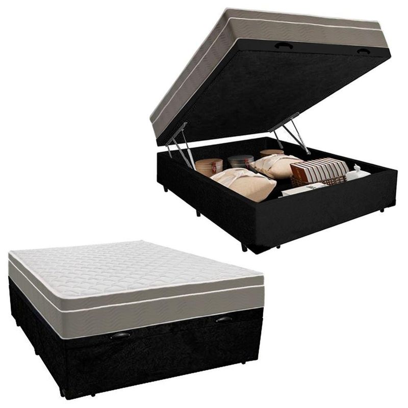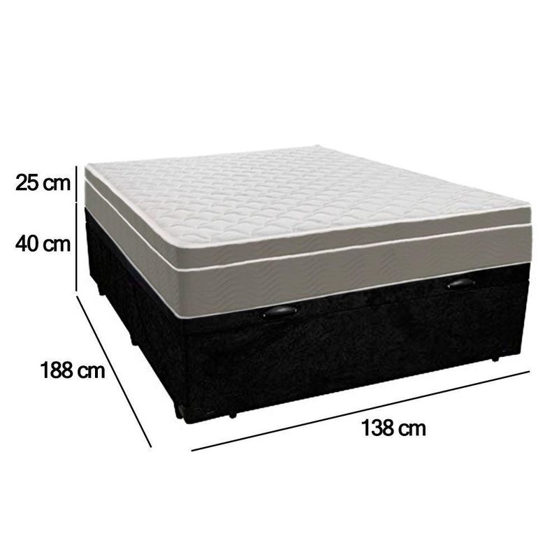 Cama Box Baú Casal Suede + Colchão Sereneprime Molas Ensacadas 138x188x69 PretoCama Box Baú Casal Suede Bipartido Preto + Colchão SerenePrime Molas Ensacadas 65x138x188O Colchão Casal SerenePrime Molas Ensacadas oferece uma experiência de sono excepcionalmente confortável e suporte personalizado para noites de descanso revitalizante. Contando com molas ensacadas e espuma, ele é a opção perfeita para acomodar bem seu corpo e deixar você bem aconchegado, levando maior bem-estar às suas horas de descanso.A Base Box é confeccionada com estrutura de madeira 100% reflorestada com tratamentos anticupim e antimofo, proporcionando alta durabilidade e resistência do produto. Possui excelente acabamento dando um ar de sofisticação e requinte.Especificações Técnicas Colchão:Marca: SerenePrimeModelo: Iso Dupla FaceProteções: Antiácaro - AntialérgicoPillow: Pillow Top EuropeuTecido de Revestimento: Bordado MatelassêForração Revestimento: Malha ImportadaFaixa Lateral: Em NobuckRevestimento Inferior: AntiderrapanteModo de Utilização: One Side No TurnDimensões do Colchão (altura x largura x comprimento) Casal: 25x138x188cmEspecificações Técnicas Base Box Baú:Material: Madeira tratadaProteções: Anticupim - AntimofoPeso máximo recomendado: até 150Kg (por pessoa)Revestimento: material (tecido) suedeAltura da base: 28cmAltura dos pés: 12cmDimensões do produto:Altura Total (base + colchão): 65cmLargura: 138cm (Duas bases box baú de 69cm cada uma)Comprimento: 188cm*As cores do produto podem variar de acordo com o monitor, a iluminação do ambiente e a sua percepção visual.*Confira as dimensões do produto e certifique-se de que passará normalmente por supostos elevadores, portas, escadas e/ou corredores de sua residência.*Verifique nossas politicas internas para que não haja nenhuma dúvida no processo de entrega ao finalizar a compra, pois não fazemos a montagem e desmontagem do produto e não nos responsabilizamos por subir escadas, corredores e elevadores ou transporte por içamento pelo lado de fora do prédio.