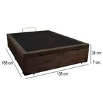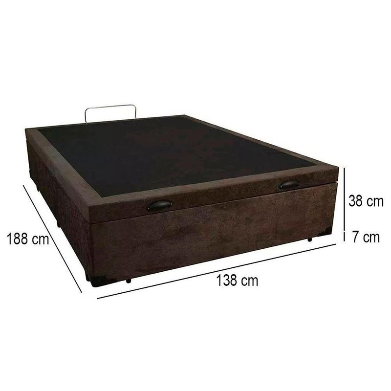 Cama Box Baú Casal Suede Mega Cama 138x188x45 MarromCama Box Baú Casal Suede Mega Cama 138x188x45 MarromNossas Base Box Baú são produzidas com os melhores materiais proporcionando praticidade, conforto, uma alta resistência e durabilidade prolongada, tornando-se uma peça que pode ser combinada com a decoração de seu quarto deixando-o moderno e sofisticado. Sabia que é a base para cama box que garante conforto, segurança e a sustentação ideal para seu colchão? Pois é! Além disso, é bom dizer que as bases convencionais vêm apenas com espaço para colocar o colchão.As cores do produto podem variar de acordo com o monitor, a iluminação do ambiente e a sua percepção visual.Confira as dimensões do produto e certifique-se de que passará normalmente por supostos elevadores, portas, escadas e/ou corredores de sua residência.Características do Baú:- Estrutura Interna: Todos os nossos produtos são produzidos com madeira e estrutura articulada de ferro com pistão de gás;- Estrutura Externa: Revestimento Tecido Suede;- Marca: Mega Cama- Tratamento Antiácaro: Sim;- Tratamento Antialérgico: Sim;- Saida de Ventilação: Sim;- Suporta até (kg): 150 Kg;- Necessita Montagem: Não;- Ambiente: Quarto;- Contém 02 puxadores, para maior facilidade na abertura;- Contém 01 arco na parte de trás para o colchão não escorregar;- Altura: 38 cm;- Largura: 138 cm;- Profundidade: 188 cm;- Possui Pés: Sim;- Altura dos Pés: 7 cm.*As cores do produto podem variar de acordo com o monitor, a iluminação do ambiente e a sua percepção visual.*Confira as dimensões do produto e certifique-se de que passará normalmente por supostos elevadores, portas, escadas e/ou corredores de sua residência.*Verifique nossas politicas internas para que não haja nenhuma dúvida no processo de entrega ao finalizar a compra, pois não fazemos a montagem e desmontagem do produto e não nos responsabilizamos por subir escadas, corredores e elevadores ou transporte por içamento pelo lado de fora do prédio.