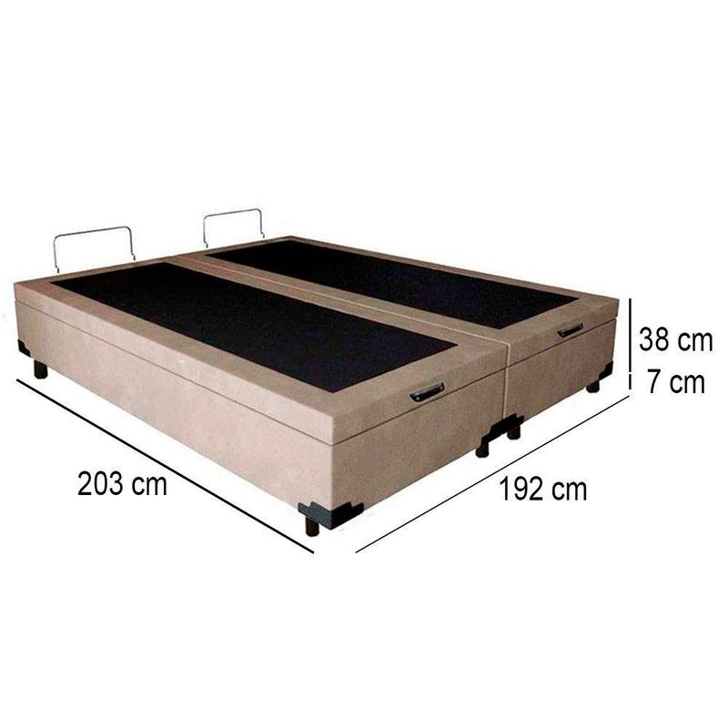 Cama Box Baú King Bipartido Suede Mega Cama Bege 192x203x45cmCama Box Baú King Bipartido Suede Mega Cama Bege 192x203x45cmA Base Box Baú é confeccionada com estrutura de madeira 100% reflorestada com tratamentos Antialérgico e Antiácaro, proporcionando alta durabilidade e resistência do produto. Possui excelente acabamento dando um ar de sofisticação e requinte.Especificações Técnicas Base Box:Material: Estrutura blindada em madeira 100% de ReflorestamentoProteções: Antialérgico - AntiácaroPeso máximo Recomendado: até 150kgRevestimento: Material (tecido) SuedeAltura da base: 38cmAltura dos pés: 7cmDimensões do produto:Altura Total (base + pés): 44cmLargura: 192cm (Duas bases com 96cm cada uma)Comprimento: 203cm*As cores do produto podem variar de acordo com o monitor, a iluminação do ambiente e a sua percepção visual.*Confira as dimensões do produto e certifique-se de que passará normalmente por supostos elevadores, portas, escadas e/ou corredores de sua residência.*Verifique nossas politicas internas para que não haja nenhuma dúvida no processo de entrega ao finalizar a compra, pois não fazemos a montagem e desmontagem do produto e não nos responsabilizamos por subir escadas, corredores e elevadores ou transporte por içamento pelo lado de fora do prédio.