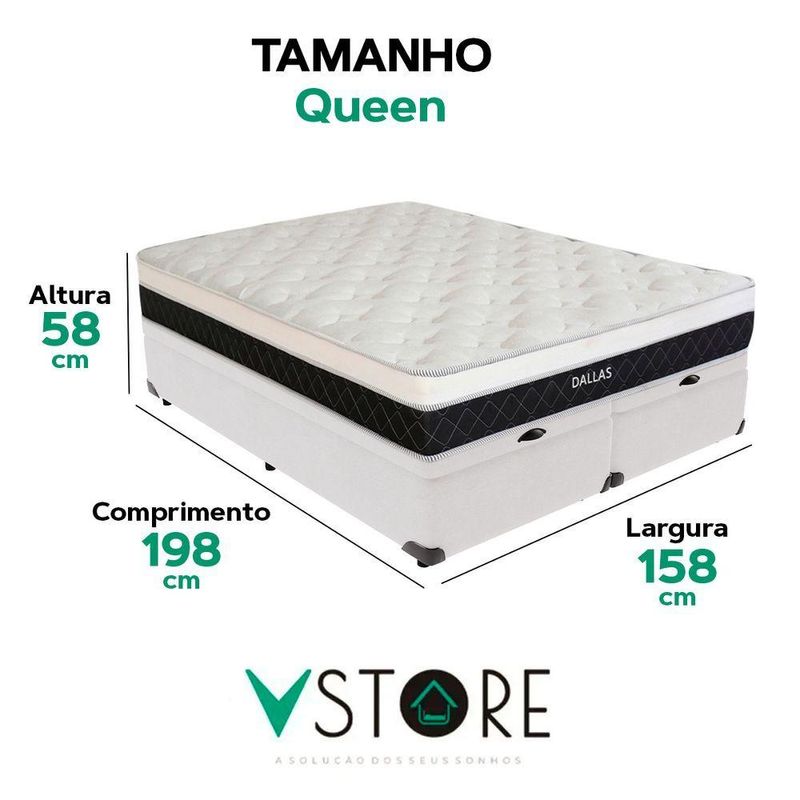 Cama Box Baú King Branco E Colchão Dallas Molas VstoreA tecnologia que a sua casa merece está na V-Store!O Conjunto Colchão Dallas e Base Box Baú Bravus combina conforto e praticidade. O colchão, com molas ensacadas, espuma D33, Euro Pillow e tecnologia EPS, oferece suporte ideal, conforto térmico, maior durabilidade e resistência. A base box baú, com estrutura reforçada e acabamento elegante, proporciona amplo espaço para armazenamento e organização do dormitório. Perfeito para quem busca qualidade, funcionalidade e sofisticação.Adquira agora e transforme suas noites de sono!Característica Do Colchão:Modelo: DallasMarca: V-StoreTamanho KingDimensões: 193x20x203 (Largura x Altura x Comprimento)Conforto: MédioSistema: Molas EnsacadasPillow: Euro PillowPeso Máximo recomendado: 150 kg (Por pessoa)Proteções: Antiácaro, antialérgico, antifungo, antimofoGarantia: 12 Meses (Espuma) / 10 anos ( Conjunto de Molas Ensacadas)Característica Da Base:Marca: V-StoreModelo: BravusCor do Box: BrancoTamanho KingDimensões: 193x44x203 (Largura x Altura x Comprimento)Estrutura: MadeiraPeso máximo recomendado: 150 kg (Por Pessoa)Altura do Box: 38 cmAltura dos Pés: 6 cmAltura total: 44 cmGarantia: 12 Meses (Estrutura) / 3 meses (Tecido)Selo Ecologicamente CorretoAtenção:- Antes de finalizar sua compra, recomendamos que verifique se as dimensões do produto são adequadas para serem transportadas pelos elevadores, portas, escadas e corredores de sua residência. Ressaltamos que não nos responsabilizamos pelo transporte do produto por meios específicos, como escadas, guinchos ou içamentos.- É possível que hajam leves variações de cor de acordo com o dispositivo que está sendo utilizado como smartphones, computadores, monitores e outros.