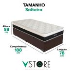Cama Box Baú Marrom E Colchão Dallas Molas Vstore 78x188x20A tecnologia que a sua casa merece está na V-Store!O Conjunto Colchão Dallas e Base Box Baú Bravus combina conforto e praticidade. O colchão, com molas ensacadas, espuma D33, Euro Pillow e tecnologia EPS, oferece suporte ideal, conforto térmico, maior durabilidade e resistência. A base box baú, com estrutura reforçada e acabamento elegante, proporciona amplo espaço para armazenamento e organização do dormitório. Perfeito para quem busca qualidade, funcionalidade e sofisticação.Adquira agora e transforme suas noites de sono!Característica Do Colchão:Modelo: DallasMarca: V-StoreTamanho SolteiroDimensões: 78x20x188 (Largura x Altura x Comprimento)Conforto: MédioSistema: Molas EnsacadasPillow: Euro PillowPeso Máximo recomendado: 150 kg (Por pessoa)Proteções: Antiácaro, antialérgico, antifungo, antimofoGarantia: 12 Meses (Espuma) / 10 anos ( Conjunto de Molas Ensacadas)Característica Da Base:Marca: V-StoreModelo: BravusCor do Box: MarromTamanho SolteiroDimensões: 78x44x188 (Largura x Altura x Comprimento)Estrutura: MadeiraPeso máximo recomendado: 150 kg (Por Pessoa)Altura do Box: 38 cmAltura dos Pés: 6 cmAltura total: 44 cmGarantia: 12 Meses (Estrutura) / 3 meses (Tecido)Selo Ecologicamente CorretoAtenção:- Antes de finalizar sua compra, recomendamos que verifique se as dimensões do produto são adequadas para serem transportadas pelos elevadores, portas, escadas e corredores de sua residência. Ressaltamos que não nos responsabilizamos pelo transporte do produto por meios específicos, como escadas, guinchos ou içamentos.- É possível que hajam leves variações de cor de acordo com o dispositivo que está sendo utilizado como smartphones, computadores, monitores e outros.