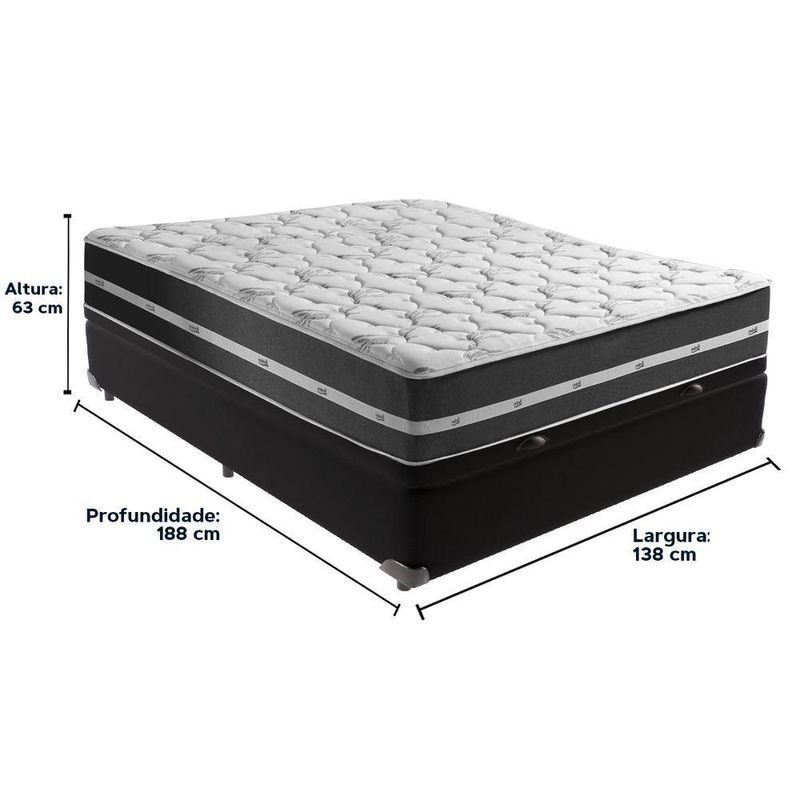 Cama Box Baú Preto E Colchão Classic Preto Molas Ensacadas Casal AnjosO conforto que sua casa precisa e a qualidade que você merece está na Kazamix!Descubra o Colchão Classic da Anjos, a combinação perfeita de funcionalidade, conforto e durabilidade. Com design clean e moderno, sua superfície plana proporciona um toque de elegância ao ambiente, enquanto as molas ensacadas garantem um suporte individualizado, ideal para um descanso tranquilo e sem transferência de movimento.Este modelo oferece conforto intermediário, adaptando-se às mais variadas preferências. Com tratamento antiácaro e antialérgico, o Classic cria um ambiente mais saudável e seguro para o seu sono. Um colchão de alta densidade que une qualidade e custo-benefício, perfeito para quem valoriza bem-estar e sofisticação. Transforme suas noites com o conforto que você merece!Modelo: Classic 26 PretoMarca: AnjosTamanho: CasalDimensões: 138x188X26 (Largura x Comprimento x Altura)Conforto: IntermediárioSistema: Molas ensacadasPillow: Não se AplicaPeso Máximo recomendado: 130 kg (Por pessoa)Proteções: Antiácaro, antialérgico, antifungo, antimofoGarantia: 1 ano pelo FabricanteO conforto que sua casa precisa e a qualidade que você merece está na KazamixAproveite cada metro quadrado do seu dormitório com a Cama Box Baú!Projetada com madeira de reflorestamento reforçada, a Cama Box Baú é a escolha ideal para quem busca otimização de espaço e praticidade na organização do dia a dia.Com um baú generoso, ela oferece a solução perfeita para armazenar travesseiros extras, cobertores, malas e muito mais. Além disso, sua estrutura robusta suporta até 150 kg por pessoa, garantindo a sustentação ideal para o seu colchão e prolongando sua vida útil.O pistão a gás robusto proporciona uma abertura suave e segura do baú, oferecendo praticidade e resistência no uso diário. Para completar, o acabamento de alta qualidade combina perfeitamente com qualquer estilo de decoração, agregando elegância e versatilidade ao seu ambiente.Não perca tempo! Adquira agora mesmo sua Cama Box Baú e diga adeus à falta de espaço e desorganização.Marca: KazaMixModelo: BaúCor do Box: PretoTamanho: CasalDimensões: 138X188X37 (Largura x Comprimento x Altura)Estrutura: MadeiraPeso máximo recomendado: 150 kg (Por Pessoa)Altura do Box: 32 cmAltura dos Pés: 5 cmAltura total: 37 cmGarantia: 03 mesesSelo Ecologicamente CorretoAtenção: Antes de finalizar sua compra, certifique-se de que as dimensões do produto sejam adequadas para serem transportadas pelos elevadores, portas, escadas e corredores de sua residência. Ressaltamos que não nos responsabilizamos pelo transporte do produto por meios específicos, como escadas, guinchos ou içamentos.