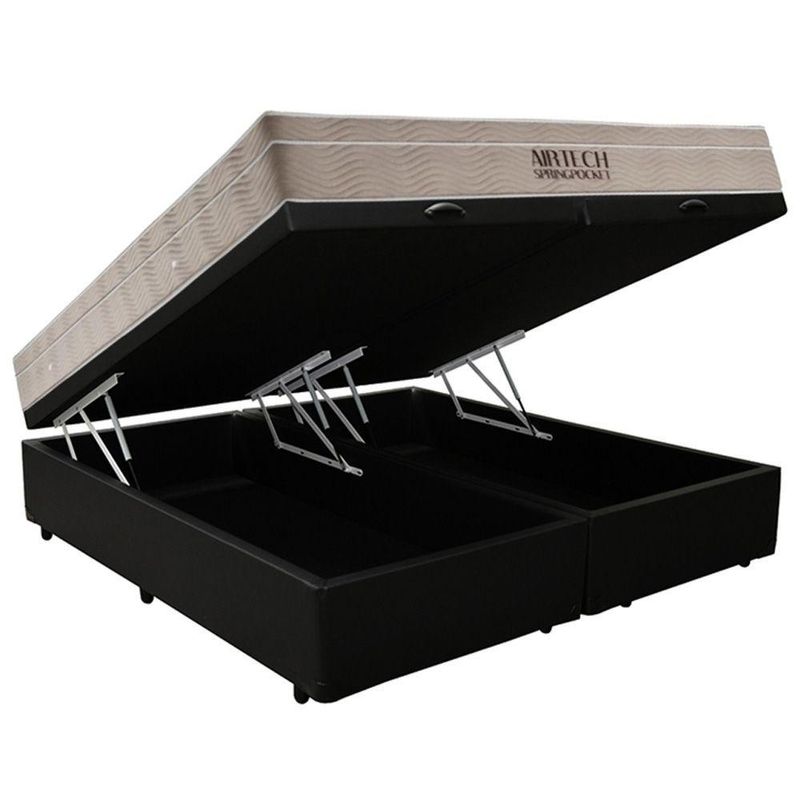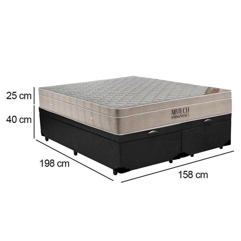 Cama Box Baú Queen Sintético Bipartido + Colchão Ortobom Airtech Molas Ensacadas 65x158x198 Cor:pretoO Colchão De Molas Ensacadas AirTech Ortobom é indicado para pessoas de até 150kg proporcionando conforto firme, o que lhe confere firmeza suficiente para preservar sua coluna durante o sono sem comprometer seu conforto. Fabricado com matérias-primas de alta qualidade e durabilidade, o AirTech Molas Ensacadas Ortobom garante conforto e por muito mais tempo.**As cores do produto podem variar de acordo com o monitor, a iluminação do ambiente e a sua percepção visual.****Confira as dimensões do produto e certifique-se de que passará normalmente por supostos elevadores, portas, escadas e/ou corredores de sua residência**Benefícios Externos do Colchão- Tipo de Pillow: Pillow Top Europeu- Tipo de Bordado do Tecido de Revestimento: Bordado Matelassê- Tipo Tecido de Forração Revestimento: Malha Importada- Tipo de Tecido de Revestimento da Faixa Lateral: Em Nobuck- Tecido com Tratamento: e - Modo de Utilização: One Side No Turn- Tipo de Forração do Revestimento Inferior: AntiderrapanteCaracterísticas Interna do Colchão- Tipo de Estrutura de Molas: Molas Ensacadas- Camadas Interna do Estofamento de Espuma: Espuma de Qualidade- Outras Características Internas: Polyframe Reforço nas bordas/ Placa de EpsCaracterísticas Gerais do Colchão- Suporte de Peso: até 120 Kg- Tipo de Conforto: Firme- Largura: 158cm- Comprimento: 198cm- Altura: 25cmBenefícios Gerais do ColchãoCertificados de Qualidade- Certificação de Qualidade Aprovada- Selo Ecologicamente Correto- Certificado inmetroVantagens Extras do o colchões de molas ensacadas- Ecológicamente CorretoNossa Avaliação- Classificação de Qualidade Muito BoaCaracterísticas do Baú:- Estrutura Interna: Estrutura em madeira 100% de Reflorestamento;- Estrutura Externa: Sintético;- Tratamento : Sim;- Tratamento : Sim;- Saida de Ventilação: Não;- Ortopedico: Não;- Tecido Antiderrapante: Não;- Suporta até (kg): 150 Kg;- Necessita Montagem: Não.- Altura: 28cm;- Largura: 158cm;- Comprimento: 198cm;- Altura dos Pés: 12cm;Verifique nossas politicas internas para que não haja nenhuma dúvida no processo de ao finalizar a compra, pois não fazemos a montagem e desmontagem do produto e/ou portas e janelas, pela escada ou içamento pelo lado de fora do prédio.