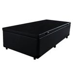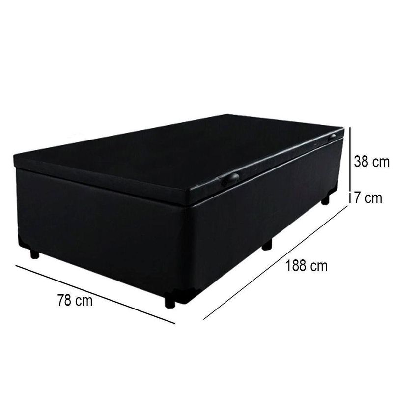 Cama Box Baú Solteiro Sintético Mega Cama Preto 88x188x45cmCama Box Baú Solteiro Sintético Mega Cama Preto 88x188x45cmPor que a Base com Baú? A Base possui um sistema de amortecimento pneumático que evita o esforço na hora de abri-lo. Também possui puxadores que auxiliam na abertura do baú. Um baú para você guardar cobertores, edredons, roupas de cama ou o que você desejar.*As cores do produto podem variar de acordo com o monitor, a iluminação do ambiente e a sua percepção visual.**Confira as dimensões do produto e certifique-se de que passará normalmente por supostos elevadores, portas, escadas e/ou corredores de sua residência*Características:- Estrutura Interna: Estrutura em madeira 100% de Reflorestamento;- Estrutura Externa: Sintético;- Tratamento Antiácaro: Sim;- Tratamento Antialérgico: Sim;- Saída de Ventilação: Sim;- Ortopédico: Sim;- Tecido Antiderrapante: Não;- Suporta até (kg): 100 Kg;- Necessita Montagem: Não;- Ambiente: Quarto;- Altura: 45 cm;- Largura: 88 cm;- Profundidade: 188 cm;- Possui Pés: Sim, feitos de madeira e fixos ao box;- Altura dos Pés: 7 cm;- Garantia do Fornecedor: 03 meses.*Não acompanha colchão*Verifique nossas politicas internas para que não haja nenhuma dúvida no processo de entrega ao finalizar a compra, pois não fazemos a montagem e desmontagem do produto e/ou portas e janelas, transporte pela escada ou içamento pelo lado de fora do prédio.