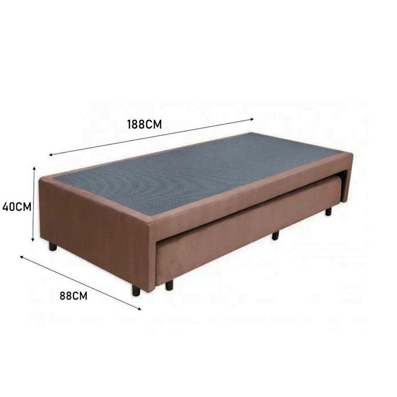 Cama Box Bicama Auxiliar Solteiro Suede Espuma 8cm 40x88x188 MarromCama Box Bicama Auxiliar Solteiro Suede Espuma 8cm 40x88x188 MarromBicama Box Solteiro Ortopédica com Cama Auxiliar é uma evolução no quesito espuma ortopédica. Ideal para o seu conforto e bem estar, este sistema de conforto firme se adapta aos contornos do corpo e promove melhor de peso sobre o colchão.*As cores do produto podem variar de acordo com o monitor, a iluminação do ambiente e a sua percepção visual.**Confira as dimensões do produto e certifique-se de que passará normalmente por supostos elevadores, portas, escadas e/ou corredores de sua residência*Características:- Cama Auxiliar: Ortopédica;- Espuma: 8 cm;- Densidade: D23;- Estrutura Interna: Estrutura em madeira 100% de Reflorestamento;- Estrutura Externa: Suede;- Tratamento : Sim;- Tratamento : Sim;- Saída de Ventilação: Sim;- Ortopédico: Sim;- Tecido Antiderrapante: Não;- Suporta até (kg): 100 Kg;- Necessita : Não;- Ambiente: Quarto;- Altura: 40 cm;- Largura: 88 cm;- Profundidade: 188 cm;- Possui Pés: Sim, feitos de madeira e fixos ao box;- Altura dos Pés: 13 cm;- Garantia do Fornecedor: 03 meses.Verifique nossas politicas internas para que não haja nenhuma dúvida no processo de ao finalizar a compra, pois não fazemos a e des do produto e/ou portas e janelas, pela escada ou içamento pelo lado de fora do prédio.