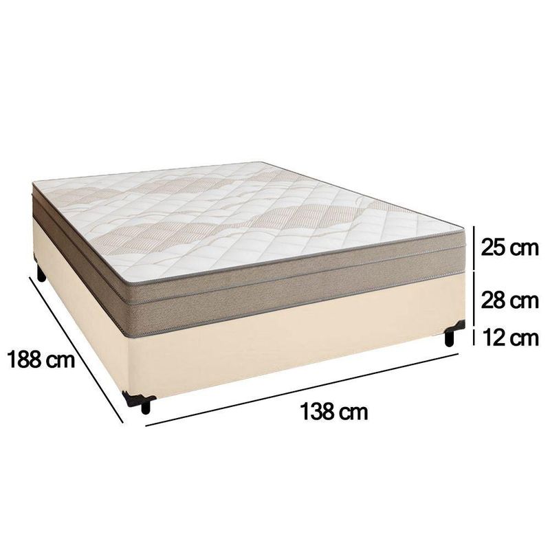 Cama Box Casal Sintético + Colchão De Molas Ensacadas Portobel Ipanema - 138x188x65cm BegeCama Box Casal Sintético + Colchão de Molas Ensacadas Portobel Ipanema - 138x188x65cmTransforme o seu quarto com a Cama Box Casal Sintético SerenePrime, que alia sofisticação e conforto. Com um acabamento em tecido sintético e elegante, esta cama box proporciona um visual moderno e aconchegante, perfeito para qualquer ambiente.Desfrute de noites mais confortáveis com o Colchão Portobel, projetado para proporcionar um sono reparador com a combinação perfeita de suporte e maciez. Suas molas ensacadas de 10 cm são individualmente embaladas, permitindo um melhor ajuste ao corpo e reduzindo a transmissão de movimento, ideal para quem divide a cama. A espuma D26 oferece a densidade ideal para o suporte sem perder o conforto, além de ser altamente resistente, garantindo durabilidade ao longo dos anos.O núcleo em EPS de 11 cm de altura reforça a estrutura do colchão, proporcionando firmeza extra e sustentação. O tampo em malha 100% poliéster oferece uma sensação agradável ao toque e é altamente respirável, mantendo uma temperatura agradável durante o sono. A faixa lateral em suede não só eleva o estilo do colchão, como também contribui para sua resistência e acabamento refinado, combinando perfeitamente com qualquer ambiente.Este colchão é a escolha perfeita para quem busca noites tranquilas e renovadoras. Suas dimensões de 138 cm de largura, 25 cm de altura e 188 cm de profundidade são ideais para quem deseja um colchão de tamanho confortável e com excelente suporte. Invista em qualidade e durabilidade com o Colchão Portobel, feito para transformar suas noites de descanso.Especificações Técnicas Colchão:Marca: PortobelModelo: Molas Ensacadas IpanemaComposição: Molas, Espuma D26, EPS de 11cm de altura.Proteções: Antiácaro - AntialérgicoTecido de Revestimento: Faixa em suedeForração Revestimento: Tampo de malha 100% poliesterDimensões do Colchão (largura x comprimeento x altura) Casal: 138x188x25cmEspecificações Técnicas Base Box:Marca: Home QueenMaterial: madeira tratadaPeso máximo recomendado: até 120Kg (por pessoa)Revestimento: material (tecido) sintéticoAltura da base: 28cmAltura dos pés: 12cmComprimento: 188cmLargura: 138cm*As cores do produto podem variar de acordo com o monitor, a iluminação do ambiente e a sua percepção visual.*Confira as dimensões do produto e certifique-se de que passará normalmente por supostos elevadores, portas, escadas e/ou corredores de sua residência.*Verifique nossas politicas internas para que não haja nenhuma dúvida no processo de entrega ao finalizar a compra, pois não fazemos a montagem e desmontagem do produto e não nos responsabilizamos por subir escadas, corredores e elevadores ou transporte por içamento pelo lado de fora do prédio.