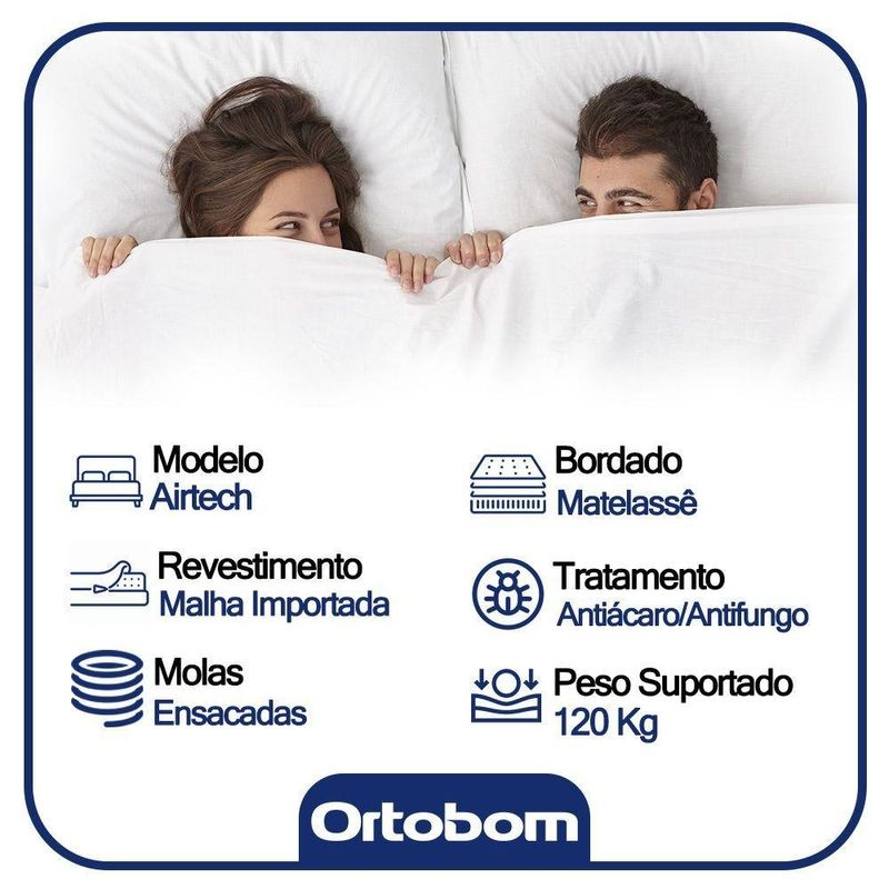 Cama Box Casal Suede + Colchão Casal Ortobom Airtech Molas (65x138x188) BegeO Colchão De Molas Ensacadas AirTech Ortobom é indicado para pessoas de até 150kg proporcionando conforto firme, o que lhe confere firmeza suficiente para preservar sua coluna durante o sono sem comprometer seu conforto. Fabricado com matérias-primas de alta qualidade e durabilidade, o AirTech Ortobom garante conforto e por muito mais tempo.**As cores do produto podem variar de acordo com o monitor, a iluminação do ambiente e a sua percepção visual.****Confira as dimensões do produto e certifique-se de que passará normalmente por supostos elevadores, portas, escadas e/ou corredores de sua residência**Benefícios Externos do Colchão- Tipo de Pillow: Pillow Top Europeu- Tipo de Bordado do Tecido de Revestimento: Bordado Matelassê- Tipo Tecido de Forração Revestimento: Malha Importada- Tipo de Tecido de Revestimento da Faixa Lateral: Em Nobuck- Tecido com Tratamento: e - Modo de Utilização: One Side No Turn- Tipo de Forração do Revestimento Inferior: AntiderrapanteCaracterísticas Interna do Colchão- Tipo de Estrutura de Molas: Molas (Ensacadas)- Camadas Interna do Estofamento de Espuma: Espuma de Qualidade- Outras Características Internas: Polyframe Reforço nas bordas/ Placa de EpsCaracterísticas Gerais do Colchão- Suporte de Peso: até 120 Kg- Tipo de Conforto: Firme- Largura: 138cm- Comprimento: 188cm- Altura: 25cmBenefícios Gerais do ColchãoCertificados de Qualidade- Certificação de Qualidade Aprovada- Selo Ecologicamente Correto- Certificado inmetroVantagens Extras do o colchões de molas - Ecológicamente CorretoNossa Avaliação- Classificação de Qualidade Muito BoaCaracterísticas do Baú:- Estrutura Interna: Estrutura em madeira 100% de Reflorestamento;- Estrutura Externa: Sintético;- Tratamento : Sim;- Tratamento : Sim;- Saida de Ventilação: Não;- Ortopedico: Não;- Tecido Antiderrapante: Não;- Suporta até (kg): 150 Kg;- Necessita Montagem: Não.- Altura: 28cm;- Largura: 138cm;- Comprimento: 188cm;- Altura dos Pés: 12cm;Verifique nossas politicas internas para que não haja nenhuma dúvida no processo de ao finalizar a compra, pois não fazemos a e desdo produto e/ou portas e janelas, pela escada ou içamento pelo lado de fora do prédio.