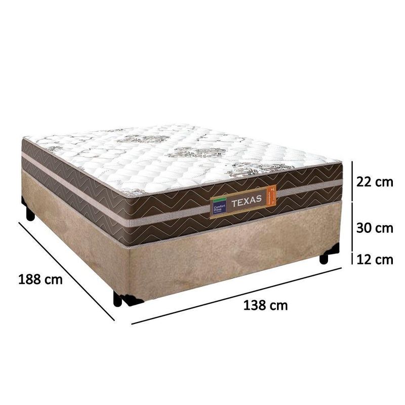 Cama Box Casal Suede + Colchão Molas Ensacadas Texas Prime Colchões Bege 138cmA Cama Box Casal Suede + Colchão Molas Ensacadas Texas 138x188x64cmÉ uma combinação que oferece uma solução completa, agilidade e praticidade na aquisição da sua cama. O Colchão Casal Texas Molas Ensacadas foi criado pensando em você. Possui molas ensacadas em sua composição, o que proporciona um conforto único. A capacidade de suporte é de até 120kg por pessoa, garantindo conforto durante o sono, além de promover um melhor apoio e qualidade de vida.A Cama Box é a opção ideal para maior aproveitamento do quarto, pois oferece espaço extra e praticidade. Produto de alta durabilidade, resistente e excelente qualidade em acabamento, totalmente em suede, o que lhe confere elegância e sofisticação em qualquer ambiente.Características do Colchão:- Marca: Prime Colchões- Cor: Marrom/Branco- Espuma: D26- Modelo: Texas- Tamanho: Casal- Tipo de Molas: Ensacadas- Revestimento Superior: Poliéster- Revestimento Lateral: Poliéster- Capacidade: 120kg por pessoas- Interior: Molas ensacadas, com espuma D26- Dimensões do colchão (largura x comprimento x altura): 138x188x22cmCaracterísticas do Box:- Estrutura Interna: Estrutura em madeira 100% de Reflorestamento- Marca: Mega Cama- Estrutura Externa: Suede- Tratamento Antiácaro: Sim- Tratamento Antialérgico: Sim- Saída de Ventilação: Não- Ortopédico: Não- Tecido Antiderrapante: Não- Suporta até (kg): 150 Kg- Necessita Montagem: Não- Dimensões do box (largura x comprimento x altura): 138x188x64cmDimensões do Produto:- Altura (Box + Colchão): 60cm- Largura: 138cm- Comprimento: 188cm- Altura dos Pés: 12cm*As cores do produto podem variar de acordo com o monitor, a iluminação do ambiente e a sua percepção visual.**Confira as dimensões do produto e certifique-se de que passará normalmente por supostos elevadores, portas, escadas e/ou corredores de sua residência.**Verifique nossas politicas internas para que não haja nenhuma dúvida no processo de entrega ao finalizar a compra, pois não fazemos a montagem e desmontagem do produto e/ou portas e janelas, transporte pela escada ou içamento pelo lado de fora do prédio.*