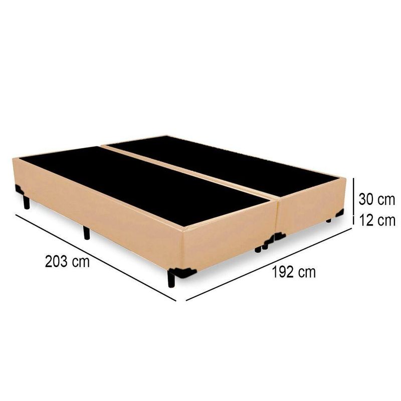Cama Box King Bipartido Sintético Mega Cama Bege 192x203x42cmCama Box King Bipartido Sintético Mega Cama Bege 192x203x42cmCama Box Bipartida é produzida com os melhores materiais, proporcionando uma alta resistência e durabilidade prolongada.Proporcionando praticidade e conforto, tornando-se uma peça que pode ser combinada com a decoração de seu quarto deixando-o moderno e sofisticado.**As cores do produto podem variar de acordo com o monitor, a iluminação do ambiente e a sua percepção visual.**Características do Box:- Estrutura Interna: Estrutura em madeira 100% de Reflorestamento- Estrutura Externa: Sintético- Tratamento Antiácaro: Sim- Tratamento Antialérgico: Sim- Saida de Ventilação: Sim- Suporta até (kg): 150 Kg- Necessita Montagem: Não- Altura: 30cm- Largura: 193cm- Largura cada box: 96cm- Profundidade: 203cm- Possui Pés: Sim- Altura dos Pés: 12cmVerifique nossas politicas internas para que não haja nenhuma dúvida no processo de entrega ao finalizar a compra, pois não fazemos a montagem e desmontagem do produto e/ou portas e janelas, transporte pela escada ou içamento pelo lado de fora do prédio.**Confira as dimensões do produto e certifique-se de que passará normalmente por supostos elevadores, portas, escadas e/ou corredores de sua residência**