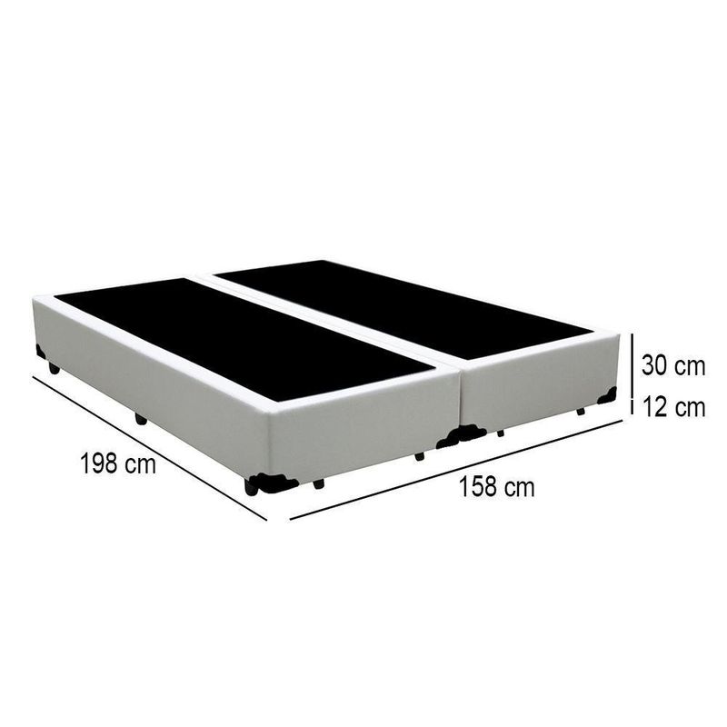 Cama Box Queen Bipartido Sintético Mega Cama Branco 158x198x42cmCama Box Queen Bipartido Sintético Mega Cama Branco 158x198x42cmA Base Box é confeccionada com estrutura de madeira 100% reflorestada com tratamentos Antialérgico e Antiácaro, proporcionando alta durabilidade e resistência do produto. Possui excelente acabamento dando um ar de sofisticação e requinte.Especificações Técnicas Base Box:Material: Estrutura blindada em madeira 100% de ReflorestamentoProteções: Antialérgico - AntiácaroPeso máximo Recomendado: até 150kgRevestimento: Material (tecido) SintéticoAltura da base: 30cmAltura dos pés: 12cmDimensões do produto:Altura Total (base + pés): 42cmLargura: 158cm (Duas bases com 79cm cada uma)Comprimento: 198cm*As cores do produto podem variar de acordo com o monitor, a iluminação do ambiente e a sua percepção visual.*Confira as dimensões do produto e certifique-se de que passará normalmente por supostos elevadores, portas, escadas e/ou corredores de sua residência.*Verifique nossas politicas internas para que não haja nenhuma dúvida no processo de entrega ao finalizar a compra, pois não fazemos a montagem e desmontagem do produto e não nos responsabilizamos por subir escadas, corredores e elevadores ou transporte por içamento pelo lado de fora do prédio.
