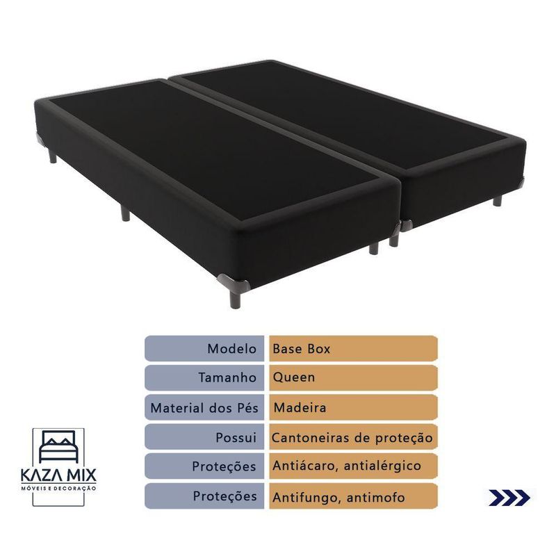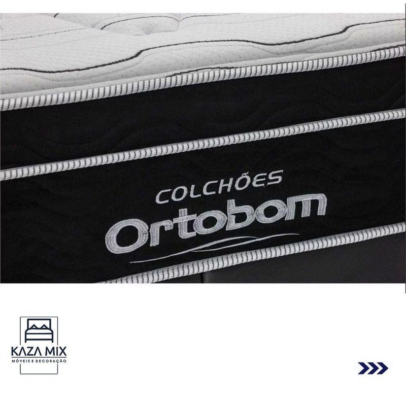 Cama Box Queen Preto E Ortobom Elegant Molas Ensacadas EuropillowBem-vindo(a) ao nosso catálogo!Apresentamos a você uma descrição completa sobre esse produto:O colchão Elegant com sua estrutura de molas ensacadas e espuma D26 de alta densidade, ele oferece suporte adequado para pessoas de até 150kg, tendo como garantia de máximo conforto o Pillow Euro. Uma camada a mais de aconchego!Colchão:Modelo: Elegant;Tamanho: Queen;Dimensões: 158x198x18cm; (largura x comprimento x altura)Conforto: Molas Ensacadas Espuma D26, Pillow Euro;Proteções: Antiácaro, antialérgico, antifungo, antimofo;Possui: Sistema No Turn, Fibra de bambu;Peso máximo recomendado: até 150Kg (por pessoa);Garantia: 03 meses;O sistema No Turn do Colchão Elegant torna sua manutenção muito mais prática e fácil, pois ele não precisa ser virado regularmente como os modelos tradicionais. Também é um produto sustentável. A fibra de bambu utilizada em sua composição é uma fonte renovável e amiga do meio ambiente.Qualidade Ortobom:O Elegant é produzido pela renomada marca Ortobom, conhecida por sua expertise em tecnologia do sono. Com anos de experiência no mercado, a Ortobom é reconhecida por oferecer produtos inovadores e de alta qualidade, que atendem às necessidades dos clientes mais exigentes.Base Box:Marca: KazaMix;Cor do Box: Preto;Revestimento da Cama: Material Sintético;Material dos pés: Madeira;Estrutura: Madeira;Peso máximo recomendado: até 150kg de cada lado;Altura do Baú: 25cm;Altura dos pés: 10cm;Altura total: 35cm;Garantia: 03 meses;Selo Ecologicamente Correto.Invista no seu sono e experimente o conforto e a qualidade!Atenção: Antes de finalizar sua compra, certifique-se de que as dimensões do produto sejam adequadas para serem transportadas pelos elevadores, portas, escadas e corredores de sua residência. Ressaltamos que não nos responsabilizamos pelo transporte do produto por meios específicos, como escadas, guinchos ou içamentos.
