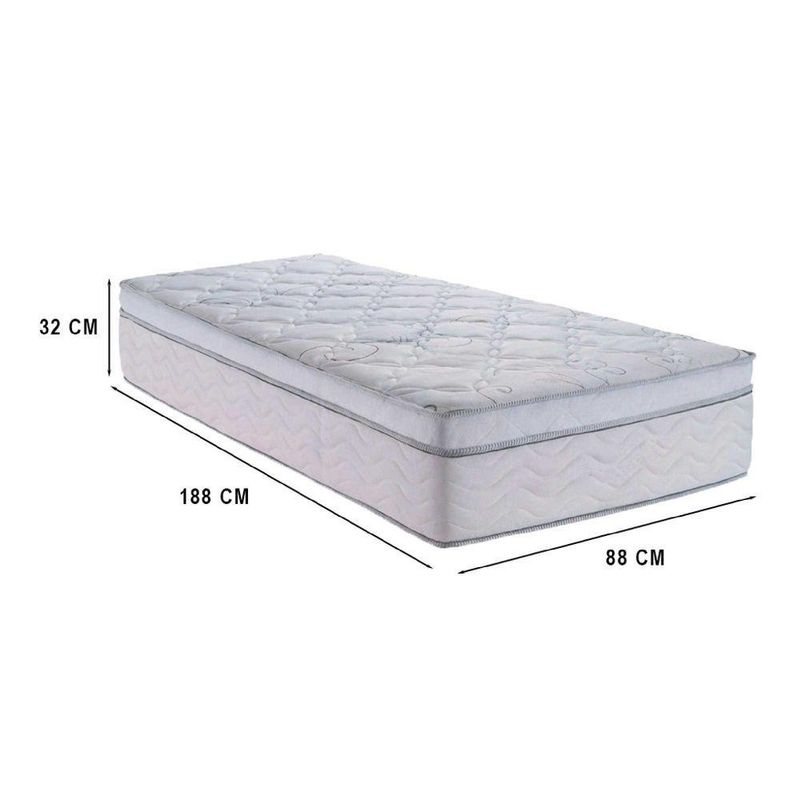 Cama Box Solteiro 88 Sintético Branco Com Colchão Toronto Molas Ensacadas Branco D33 32cmConjunto de cama e colchão ideal para conforto e praticidade. O colchão conta com molas ensacadas e espuma D33, oferecendo firmeza e adaptação ao corpo, com suporte de até 150 kg por pessoa. Antialérgico e com proteção contra ácaros, fungos e mofos. A base box em madeira com revestimento em material sintético possui ;uma base firme, unindo funcionalidade e design moderno. ;Características do Box Solteiro:- Estrutura Interna: Estrutura em madeira 100% de Reflorestamento- Estrutura Externa: ;Material ;Sintético;- Tratamento Antiácaro: Sim;- Tratamento Antialérgico: Sim;- Tecido Antiderrapante: Não;- Suporta até kg: 100 Kg;- Necessita Montagem: Não;- Garantia do Fornecedor: 3 meses;- Ambiente: Quarto;- Cor Predominante: ;Branco;- Altura: 40 cm;- Largura: 88 cm;- Profundidade: 188 cm;- Possui Pés: Sim;- Altura dos Pés: 12 cm;- Material da estrutura: Madeira;- Material dos Pés: Plástico; ;Características do Colchão Toronto:Conforto: intermediário;Densidade: D33;Estrututa : Mola ensacada, Espuma ;D33 e EPS;Suporta: até ;150kg por pessoa;Possui EPS: Sim;Cor: Branco;Proteções: Antiácaro, Antialérgico, Antifungo e Antimofo;Dimensoões (Altura x Largura x Comprimento): 32cm x 88cm x 188cm;Garantia: 03 meses. ;Importante:- As ;imagens ambientadas ;são meramente ilustrativas e podem apresentar itens que não compõe o produto;- As ;cores do produto ;podem variar de acordo com o monitor, a iluminação do ambiente ou sua percepção visual;- Não nos responsabilizamos em subir pelas escadas ou içar o produto.- Montagens, desmontagens e instalações são responsabilidades do cliente. Estes serviços não estão inclusos no valor do produto. Para evitar imprevistos na sua entrega, confira as dimensões do produto no momento da compra e certifique-se de que ele passará por elevadores, portas, escadas e corredores.