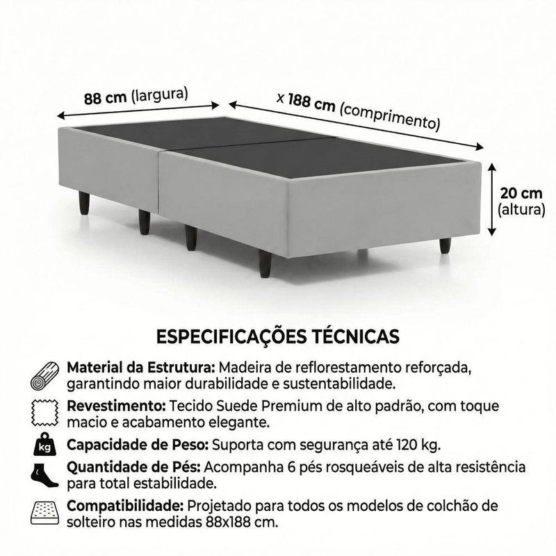 Cama Box Solteiro Base Box Dobrável para Colchão 88X188CM Compacto Estrutura Madeira BegeOrganize o quarto com a Cama Box Solteiro Base Box Dobrável Compacto Bege, ideal para colchão 88x188 cm. Sua estrutura reforçada em madeira de reflorestamento oferece resistência para o uso diário, enquanto o sistema dobrável facilita o transporte e o armazenamento em espaços reduzidos. O revestimento em tecido Suede Premium de toque macio agrega conforto visual e um acabamento elegante ao ambiente. É uma ótima escolha para apartamentos, quartos compactos ou como cama extra de montagem rápida. A base conta ainda com pés rosqueáveis de alta resistência, garantindo estabilidade durante o uso.Vantagens e diferenciais Estrutura reforçada: madeira de reflorestamento que garante maior durabilidade diária. Sistema dobrável: facilita o transporte por portas, escadas e elevadores estreitos. Design compacto: pode ser guardado ocupando pouco espaço quando não está em uso. Revestimento em Suede: tecido de toque macio que valoriza a decoração do quarto. Pés rosqueáveis: 6 pés removíveis que proporcionam estabilidade à base. Compatibilidade padrão: ideal para colchões de solteiro nas medidas 88x188 cm.Especificações Técnicas Modelo: Base Box Dobrável Solteiro Compacto Bege Tamanho: Solteiro Tipo de produto: Cama box solteiro Material da estrutura: Madeira de reflorestamento reforçada Revestimento da base: Tecido Suede Premium Cor da base: Bege Possui baú: Não Possui pés: Sim Tipo de pés: Removíveis, rosqueáveis Quantidade de pés: 6 Altura do produto: 20 cm Largura do produto: 88 cm Profundidade do produto: 188 cm Capacidade de peso: Suporta até 120 kg Compatibilidade de colchão: Colchões de solteiro 88x188 cmObservações importantes A montagem ou instalação é de responsabilidade do comprador. Verifique se o local de entrega possui espaço e acesso adequados conforme as dimensões do produto. A entrega é realizada no térreo, não incluindo subida de escadas ou içamento. O produto não acompanha itens decorativos ou acessórios utilizados nas imagens.