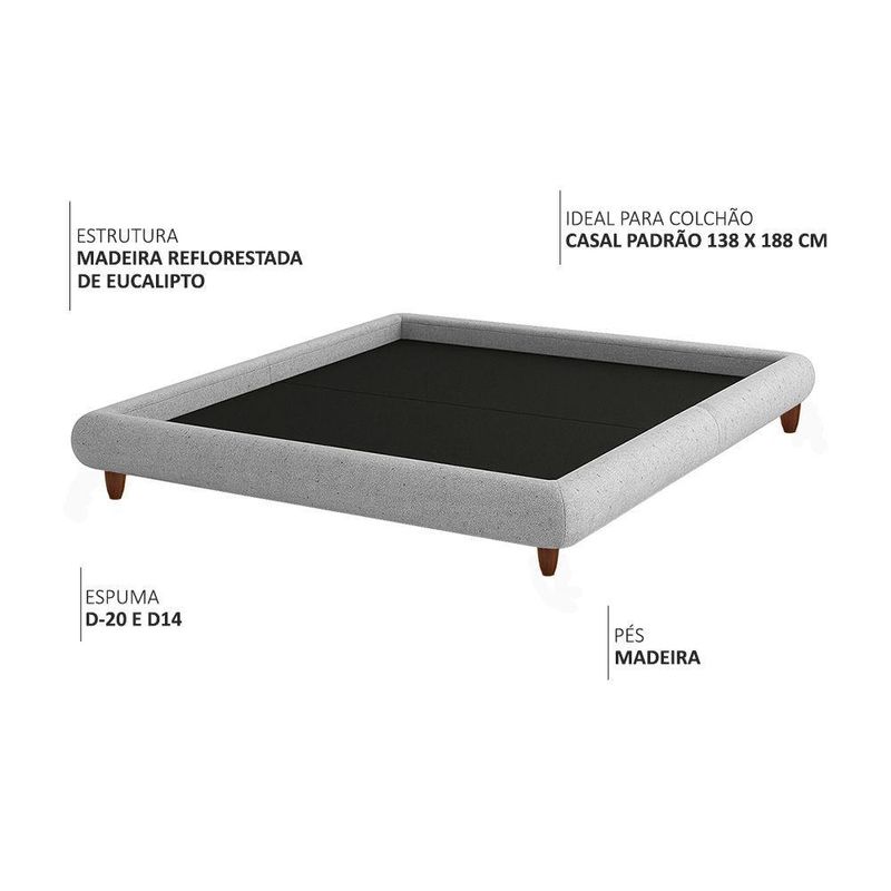 Cama Casal Base Box Pés Madeira 156cm Emma Linho Cinza Claro - Nexta CasaCama Emma – é a tradução perfeita da união entre sofisticação e durabilidade.Esta peça é um verdadeiro complemento de design para o seu quarto!Descrição do ProdutoMais do que sustentar o seu colchão, esta base de cama foi pensada para transformar a forma como você enxerga o seu quarto. Seu design contemporâneo une formas arredondadas e suaves a uma estrutura firme, com pés de madeira que garantem estabilidade e durabilidade. O revestimento em linho adiciona um toque sofisticado e versátil, combinando com diferentes estilos de decoração. Uma peça que traduz equilíbrio entre funcionalidade e estética, tornando-se o detalhe que faz toda a diferença no seu espaço de descanso!Características Técnicas Estrutura: Madeira de reflorestamento (pinus, eucaliptos e placas de MDF) com imunização contra mofo, cupim e micro-organismos. Material do Enchimento da Estrutura: D-20 e D-14. Revestimento: Linho Pés: Madeira. Ideal para Colchão Casal Padrão: 138 x 188 cm.Medidas Altura Total: 28 cm Largura: 156 cm Profundidade: 200 cm Pés: 13 cm Peso: 53 kgMedidas Internas Altura: 7 cm Largura: 139 cm Profundidade: 189 cmDiferenciais Cama bipartido. Lateral estofada. Ideal para colchão de casal 138 x 188 cm. Quantidade de Volumes: 2. Necessidade de Montagem: Sim - fixação dos pés e encaixe dos módulos.Cuidados Utilizar um pano levemente umedecido com água, seguido de pano seco. Evitar exposição ao sol para preservar a cor vibrante do tecido. Não usar produtos abrasivos ou escovas.Garantia 3 meses contra de fabricação.Observações A tonalidade da cor pode variar de acordo com o lote do fabricante. Imagens ilustrativas; tonalidade pode variar devido à configuração de cores da tela. Objetos de decoração não inclusos. Produtos enviados embalados com , reduzindo riscos de danos. Verificar as condições da embalagem na e reportar danos no . até a porta de entrada ou portaria. Confirme as dimensões e compatibilidade do de instalação. Não nos responsabilizamos por montagem, desmontagem, instalação ou por escadas/elevadores.