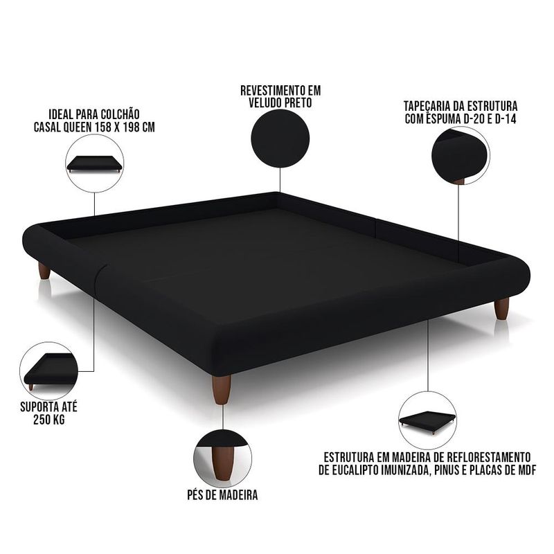 Desenvolvida para decorar o quarto de casal e também levar o conforto que você precisa, a Base de Cama Otto, da Lyam Decor, é sinônimo de elegância e estilo. Com essa base de cama queen você pode aproveitar tanto colchão casal de espuma, quanto colchão box, desde que estejam dentro das medidas internas (e você pode conferí-las logo mais abaixo). Além dessa versatilidade, o design clássico expresso nos pés de madeira dá um toque de personalidade ao ambiente, enquanto as laterais estofadas com espuma D-20 e D-14 agregam suavidade e um toque macio. Para completar, essa base para colchão é produzida com materiais de altíssima qualidade, o que garante uma estrutura resistente e duradoura. Ahh, e você pode combinar essa cama de casal moderna com diversos tipos de cabeceira. Basta usar a sua criatividade e bom gosto para escolher uma que melhor representa você. Aqui na Lyam Decor temos diversos modelos que você vai amar. E aí, está esperando o quê para deixar o seu quarto moderno e aconchegante? Adicione agora mesmo ao seu carrinho e surpreenda-se! Dimensões da Produto (L x A x P) 176 x 28 x 210 cm Medidas Internas: Largura x Altura x Profundidade: 159 x 7 x 199 cm Altura dos Pés: 13 cm Características: Estrutura em madeira de reflorestamento de eucalipto imunizada contra mofo, cupim e micro-organismos, pinus e placas de MDF. Revestimento em Veludo na cor Preto. Tapeçaria da estrutura com espuma D-20 e D-14. Ideal para colchão casal queen 158 x 198 cm. Não acompanha colchão e cabeceira. Pés de madeira. Peso suportado: Até 250 kg. - Por se tratar de estofado as medidas podem ter uma pequena variação de até 3 cm. - A tonalidade do produto real poderá ter ligeira variação devido o lote de tecidos. - Indicado para uso residencial, sua limpeza deve ser feita com pano levemente umedecido em água limpa, sem esfregar, não utilizar produtos abrasivos, desengordurantes, álcool ou solvente. Observações importantes: - Produto para uso residencial em ambiente interno, não devendo ficar exposto diretamente ao sol, calor e umidade excessivos. - Pode haver alguma diferença de tonalidade entre a imagem e o produto real, por conta do tratamento de imagens e a calibração de cores do seu monitor. - As imagens são meramente ilustrativas, não acompanham objetos de decoração e eletrônicos. - Ao receber a mercadoria, o cliente deve verificar as condições da embalagem, caso haja alguma avaria não assine o comprovante de recebimento e entre em contato com nossa loja para orientações. - Montagem, desmontagem e outras instalações serão de responsabilidade do cliente. Não nos responsabilizamos, no ato da entrega, por subir escadas/elevadores ou pelo transporte por guincho em apartamentos. Eventuais despesas são de responsabilidade do comprador. - Confira as dimensões do produto e certifique-se de que passará normalmente por supostos elevadores, portas, escadas e/ou corredores de sua residência. - Para mais informações, acesse nossa Central de Atendimento.