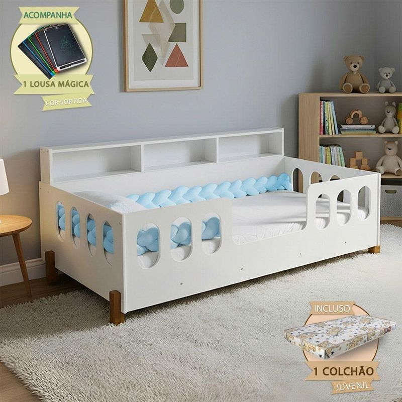 Cama Completa Nina Com Colchão Exonval Trança Azul 2,5m Para Quarto Infantil Acompanha Lousa MagicaA Cama Montessoriana Nina foi desenvolvida para proporcionar conforto, segurança e autonomia no dia a dia das crianças, seguindo os princípios do método Montessori. Com estrutura baixa e acessível, ela incentiva a independência infantil, permitindo que a criança suba e desça da cama com facilidade e segurança.O modelo conta com design lúdico e funcional, ideal para compor quartos infantis acolhedores e organizados. A cama possui proteção lateral vazada, que auxilia na segurança durante o sono, além de nichos superiores que ajudam na organização de livros, brinquedos e objetos decorativos. O conjunto acompanha colchão, travesseiro bordado bem estofado, trança protetora e uma lousa mágica infantil, oferecendo praticidade e um visual harmonioso ao ambiente.É a escolha ideal para quem busca um quarto infantil bonito, seguro e pensado especialmente para o desenvolvimento da criança.CaracterísticasCor da estrutura: BrancoSuporta até 80 kgEstrutura em MDF 12 mmNichos superiores em MDF 15 mmIluminação LED com entrada USB instalada nos nichos superioresEstrado suspenso a 5 cm do chãoLousa mágica infantil inclusa, cor sortidaPintura UV com verniz brilhoProduto entregue desmontadoAcompanha kit de montagem (parafusos) e manualMedidas da camaAltura: 64 cmLargura: 153 cmProfundidade: 85 cmMedidas do colchãoAltura: 10 cmLargura: 150 cmComprimento: 70 cmTrança protetoraCor da trança: Azul Bebê / Baby BlueComprimento da trança: 250 cmATENÇÃOAS IMAGENS SÃO MERAMENTE ILUSTRATIVAS E PODEM APRESENTAR VARIAÇÕES EM DETALHES DEPENDENDO DO MONITOR, ILUMINAÇÃO DO AMBIENTE OU PERCEPÇÃO VISUAL DO USUÁRIO.Cama Completa Nina com Colchão Exonval Trança Azul 2,5m para Quarto Infantil Acompanha Lousa Magica