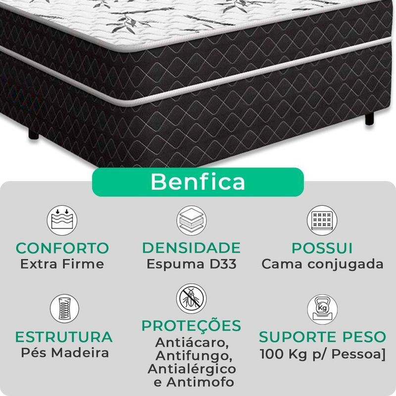 Cama Conjugada Solteiro Benfica D33 V-store 88x188x50A tecnologia e funcionalidade que sua casa merece estão aqui!A Cama Conjugada Benfica é a escolha perfeita para quem busca qualidade, conforto e praticidade. Com o colchão acoplado à base, ela oferece uma solução completa para o seu dormitório, eliminando a necessidade de peças separadas e otimizando o espaço com estilo e funcionalidade.Produzida com espuma D33 e conforto extra firme, proporciona suporte ortopédico e o alinhamento ideal para a sua coluna, garantindo noites de sono reparadoras. O box, feito com madeira reflorestada e estrutura super resistente, assegura a durabilidade e a qualidade que você merece.Adquira agora mesmo e transforme suas noites de sono com conforto, qualidade e praticidade!CARACTERÍSTICAS DO PRODUTOMarca: V-StoreModelo: Cama Conjugada BenficaCor do Box: PretoTamanho SolteiroDimensões: 88x50x188 (Largura x Altura x Comprimento)Estrutura: Espuma D33Peso máximo recomendado: 100 kg (Por Pessoa)Altura do Box: 38 cmAltura dos Pés: 3 cmAltura total: 50 cmGarantia: 3 Meses (Estrutura e Estofamento) / 3 Meses (Tecido)Selo Ecologicamente CorretoAtenção:- Antes de finalizar sua compra, recomendamos que verifique se as dimensões do produto são adequadas para serem transportadas pelos elevadores, portas, escadas e corredores de sua residência. Ressaltamos que não nos responsabilizamos pelo do produto por meios específicos, como escadas, guinchos ou içamentos.- É possível que hajam leves variações de cor de acordo com o dispositivo que está sendo utilizado como smartphones, computadores, monitores e outros.