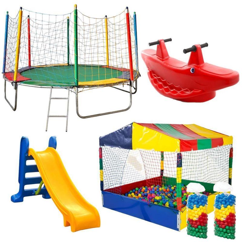 Cama Elástica 3,05m Piscina De Bolinhas 1,50m 1000 Bolinhas E Escorregador Médio Gangorra 2 LugaresCom 20 anos de experiência, a Rotoplay Brinquedos leva alegria para as crianças com produtos de qualidade e segurança. Somos uma fábrica especializada em cama elástica e piscina de bolinhas — diversão garantida, direto da nossa fábrica para a sua casa!Cama Elástica 3,05mMedidas (Valores Aproximados):Diâmetro total: 3,05mAltura total: 1,90mAltura do chão a lona: 60cmEspecificações:Estrutura em aço galvanizado;Acessórios com proteção UV;Sistema de impulsão por 64 molas;4 pés em formato de U;Rede de proteção em polipropileno multicolorida;Sistema de montagem do trampolim por encaixe;Suporta até 150 kg;Lona de salto; (A cor varia de acordo com a disponibilidade do estoque, não é possível escolher a cor da lona);Protetor de MolasEscada.Piscina De Bolinhas Quadrada 1,50m X 1,50mMedidas (Valores Aproximados):Largura: 1,50mAltura total: 1,70mAltura da tábua lateral: 30cmEspecificações:Estrutura em aço galvanizado;Acessórios com proteção UV;Rede de proteção em polipropileno multicolorida;Sistema de montagem por encaixe;Revestida com isotubos blindados.1000 Bolinhas:Produzidas com materiais de alta resistência e qualidade (proporcionam uma brincadeira alegre e sem riscos);Atóxico (não prejudicam a saúde da criança e proporcionam maior higiene);Sistema anti quebra (você não perde bolinhas quebradas, e não machuca as crianças);Com sistema emborrachado (a bolinha não amassa, você aperta e ela volta na hora);As bolinhas são enviadas em cores sortidas e aleatórias, de acordo com a disponibilidade do estoque.Gangorra 2 LugaresÉ confeccionada em material de alta qualidade com pigmento que não desbota com chuva e sol, garantindo a resistência e durabilidade do produto;Cores sortidas predominante nas cores primárias;Peso: 3Kg;Comprimento: 1,03 cm;Largura: 0,38 cm;Altura: 0,43 cm;Apoio para os Pés: Sim;Composição da Estrutura: Plástico;Processo de fabricação: Roto moldagem;Idade Recomendada: 1 a 4 anos;Suporta quantas crianças: 02.A cor é enviada de acordo com a disponibilidade de estoque.O protetor de molas é apenas para proteger contra quedas, evite pisar no acessório, pois isto pode danificá-lo.Atenção: A montagem do produto deve ser de acordo com as instruções do fabricante, a montagem sem seguir estas instruções, pode danificar o produto!Garantia de fábrica: 90 dias!Imagem meramente ilustrativa, a cor varia de acordo com disponibilidade em estoque.