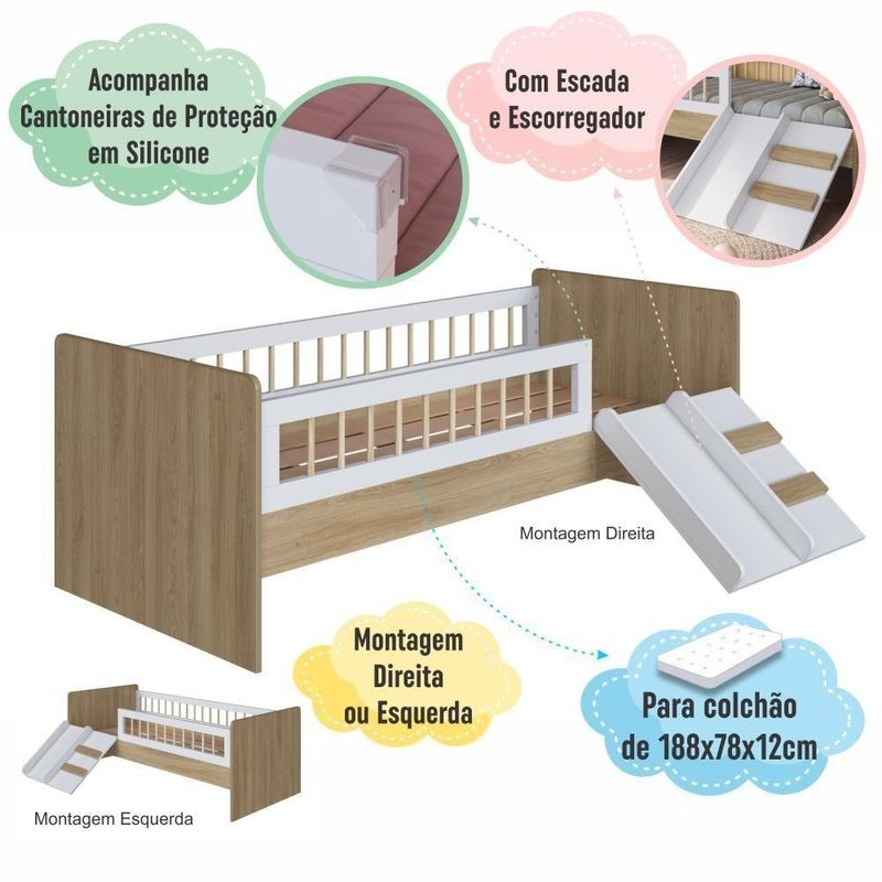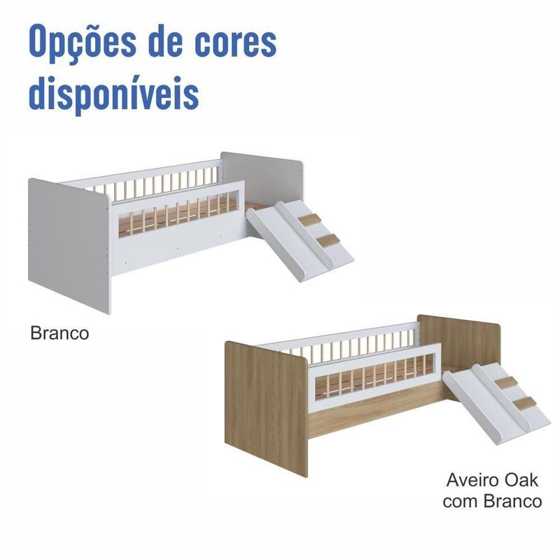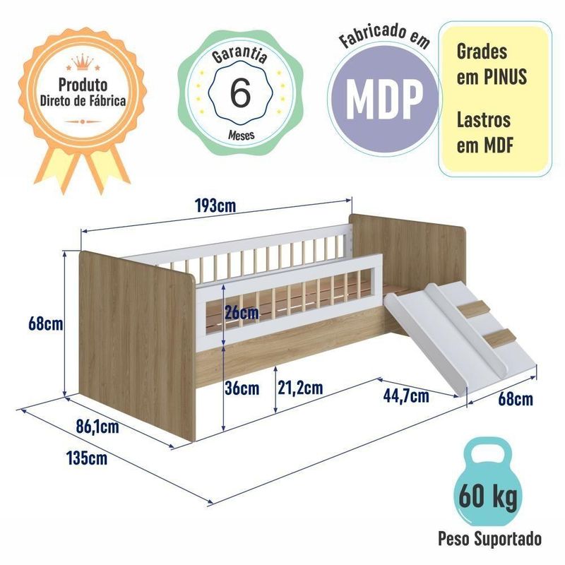 Cama Infantil Montessoriana De Solteiro Menino Menina Com Escada Escorregador E Grade De Proteção Aveiro Oak Com BrancoA Cama Infantil Montessoriana de Solteiro para Menino e Menina 193cm com Escada, Escorregador e Grade de Proteção traz o melhor do estilo Montessori para o quarto do seu filho. Um conceito lúdico para estimular a autonomia e aperfeiçoar o potencial criativo das crianças desde a primeira infância. Com grades em Pinus, trazendo leveza e um toque diferenciado no design. Escadinha e escorregador que trazem pura diversão ao ambiente, proporcionando momentos de descontração com .Produto 100% MDP com estrado em MDF de 6mm e o suporte em madeira maciça com 35mm.Acompanha cantoneira de proteção de quina.DIMENSÕES DA CAMA MONTADA:Altura: 68cmLargura: 135cmComprimento: 193cmPeso suportado: 60KgCORES:BrancoAveiro Oak com BrancoPOSSIBILITA MONTAGEM DIREITA OU ESQUERDA.PRODUTO ENTREGUE DESMONTADO.MONTAGEM NÃO INCLUSA.NÃO ACOMPANHA COLCHÃO.COLCHÃO INDICADO (LXPXA): 188x78x12cm.Produto composto por 2 volume.Acompanha manual de montagem.Peso total do produto: 42,80Kg.Altura do estrado até o chão: 29cm.Não possui rodízios.DICAS DE MONTAGEMForre o chão com o próprio papelão.Separe as peças e acessórios de acordo com o manual.Confira se todas as peças foram recebidas corretamente.Use um pano levemente umedecido com água, seguido de pano seco. Não utilize produtos químicos ou abrasivos. Marca: Completa Móveis | Material: MDP | Acabamento: Fosco | Tamanho da Cama: Solteiro | Modelo: Cama de Solteiro Montessoriana | Comprimento (cm): 193 | Largura (cm): 135 | Altura (cm): 68 | Peso do Produto (Kg): 42,80 | Quantidade de Volume: 2 | Peso Suportado (Kg): 60 | Material do Estrado: Suportes dos lastros em madeira maciça e lastros em MDF | Altura do Estrado até o Chão (cm): 29 | Colchão Indicado (LxPxA cm): 188x78x12 | Acompanha Colchão: Não | Com Esacada: Sim | Possui Rodízios: Não | Necessita Montagem: Sim | Nível de Dificuldade da Montagem: Médio | Sistema de Montagem: Sistema de montagem via parafusos, cavilhas, pregos, sistema minifix, parafusos união e porcas elípticas | Duração da Garantia: 6 Meses | Tipo de Garantia: Garantia do Fabricante | Dimensão (AxLxC cm): 68x135x193 | País de Origem: | Quantidade de Item: 1 | Inclui Manual de Montagem: Sim | Tipo de Cama: Cama Infantil Montessoriana com Escada, Escorregador e Grade de Proteção | Cor: Aveiro Oak com Branco