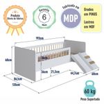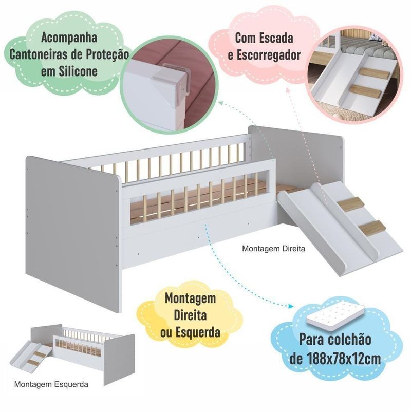 Cama Infantil Montessoriana De Solteiro Menino Menina Com Escada Escorregador E Grade De Proteção BrancoA Cama Infantil Montessoriana de Solteiro para Menino e Menina 193cm com Escada, Escorregador e Grade de Proteção traz o melhor do estilo Montessori para o quarto do seu filho. Um conceito lúdico para estimular a autonomia e aperfeiçoar o potencial criativo das crianças desde a primeira infância. Com grades em Pinus, trazendo leveza e um toque diferenciado no design. Escadinha e escorregador que trazem pura diversão ao ambiente, proporcionando momentos de descontração com .Produto 100% MDP com estrado em MDF de 6mm e o suporte em madeira maciça com 35mm.Acompanha cantoneira de proteção de quina.DIMENSÕES DA CAMA MONTADA:Altura: 68cmLargura: 135cmComprimento: 193cmPeso suportado: 60KgCORES:BrancoAveiro Oak com BrancoPOSSIBILITA MONTAGEM DIREITA OU ESQUERDA.PRODUTO ENTREGUE DESMONTADO.MONTAGEM NÃO INCLUSA.NÃO ACOMPANHA COLCHÃO.COLCHÃO INDICADO (LXPXA): 188x78x12cm.Produto composto por 2 volume.Acompanha manual de montagem.Peso total do produto: 42,80Kg.Altura do estrado até o chão: 29cm.Não possui rodízios.DICAS DE MONTAGEMForre o chão com o próprio papelão.Separe as peças e acessórios de acordo com o manual.Confira se todas as peças foram recebidas corretamente.Use um pano levemente umedecido com água, seguido de pano seco. Não utilize produtos químicos ou abrasivos. Marca: Completa Móveis | Material: MDP | Acabamento: Fosco | Tamanho da Cama: Solteiro | Modelo: Cama de Solteiro Montessoriana | Comprimento (cm): 193 | Largura (cm): 135 | Altura (cm): 68 | Peso do Produto (Kg): 42,80 | Quantidade de Volume: 2 | Peso Suportado (Kg): 60 | Material do Estrado: Suportes dos lastros em madeira maciça e lastros em MDF | Altura do Estrado até o Chão (cm): 29 | Colchão Indicado (LxPxA cm): 188x78x12 | Acompanha Colchão: Não | Com Esacada: Sim | Possui Rodízios: Não | Necessita Montagem: Sim | Nível de Dificuldade da Montagem: Médio | Sistema de Montagem: Sistema de montagem via parafusos, cavilhas, pregos, sistema minifix, parafusos união e porcas elípticas | Duração da Garantia: 6 Meses | Tipo de Garantia: Garantia do Fabricante | Dimensão (AxLxC cm): 68x135x193 | País de Origem: | Quantidade de Item: 1 | Inclui Manual de Montagem: Sim | Tipo de Cama: Cama Infantil Montessoriana com Escada, Escorregador e Grade de Proteção | Cor: Branco