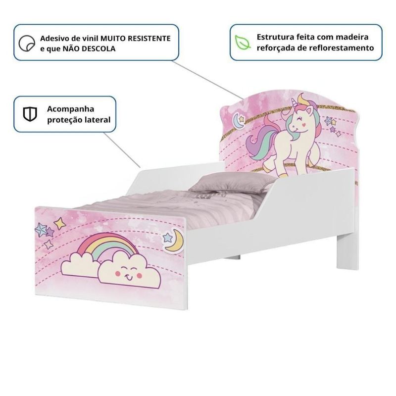 Cama Infantil Tick Unicónio Rosa Com ColchãoA Cama Infantil conta com design moderno e exclusivo proporcionando muito conforto e segurança para a criança.Um ambiente alegre e colorido levará a imaginação de seu filho as alturas.Bordas arredondadas, evitando riscos de acidentes e adesivos em vinil de alta qualidade.Produzida em 100% em MDFPESO SUPORTADO: 40 KGCOLCHÃO: ACOMPANHA COLCHÃO MINI CAMA D18 COM SELO DE QUALIDADE INMETROTAMANHO DA CAMA: MINI CAMA INFANTIL PARA CRIANÇAS DE ATÉ 6 ANOS APROX.Dimensões da Cama:Altura: 90,7 cmLargura: 79 cmProfundidade: 153 cmInformações da Cama:Cor da Cama: BrancaTema do Adesivo:Unicónio RosaMaterial Principal: MDFPeso Suportado: 40 KgColchão: Sim, acompanha colchão Mini Cama D18 com selo de Qualidade INMETROMedidas do Colchão:Altura: 10 cmLargura: 70 cmProfunidade:150 cmItens Inclusos:1 Cama Infantil1 ColchãoManual de MontagemKit completo para montagem e manual de instruçõesGarantia:3 meses contra defeito de fabricaçãoInformações Adicionais:- Fotos meramente ilustrativas do produto no ambiente.- Os objetos que ambientam as fotos não acompanham o produto;- Verificar descrição e tamanho do produto antes da compra.- Avaliar a mercadoria no ato do recebimento e recusar em caso de divergência ou avarias.- Mantenha as informações de contato e endereço de entrega atualizados para entrarmos em contato caso necessário.- Limpar com flanela ou pano macio seco, não utilizar produtos abrasivos, desengordurantes, álcool ou solvente. Não expor o produto diretamente à luz solar e à umidade.* Sugerimos a contratação de um montador profissional para a montagem do produto. Não nos responsabilizamos por avarias causadas no ato da montagem.* Não nos responsabilizamos pela montagem e desmontagem do produto no ato da entrega e devolução, assim como os custos gerados nestas situações.* A transportadora entregará o produto no andar térreo do endereço de entrega.* Não nos responsabilizamos por subir escadas, corredores e elevadores ou transporte por guincho em apartamentos. ALTURA: 90,7 | LARGURA: 79 | COMPRIMENTO: 153 | MATERIAL PRINCIPAL: MDF | COR PREDOMINANTE: Rosa | TIPO DE CAMA: Infantil | POSSUI COLCHÃO: Sim | GÊNERO: Unissex | PESO SUPORTADO (KG): 40 | ALTURA DO PRODUTO COM EMBALAGEM (CM): 22,5 | LARGURA PRODUTO COM EMBALAGEM (CM): 56 | COMPRIMENTO PRODUTO COM EMBALAGEM (CM): 151 | PESO PRODUTO COM EMBALAGEM (KG): 21,7 | PESO DO PRODUTO (KG): 21,7 | DESCRIÇÃO DO TAMANHO: Altura: 90,7cm x Comprimento: 153cm x Largura: 79cm | MATERIAL PARA FILTRO: MDF | ESTADO DE ORIGEM: SP
