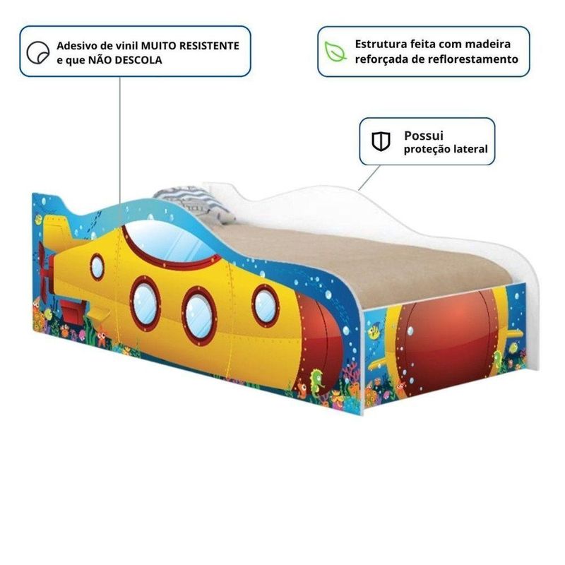 Cama Speciale Infantil 158cm X 73cm Kmcb SubmarinoPerfeita para criar um espaço aconchegante, segura e cheio de diversão, nossa cama speciale infantil combina conforto, estilo e praticidade. Garantindo ainda mais segurança durante o sono e as brincadeiras. Com designs coloridos e detalhes que estimulam a imaginação, ela é a escolha ideal para deixar o quarto do seu filho ainda mais especial. Feita com materiais de alta qualidade e estrutura resistente, garante segurança e durabilidade para os momentos de descanso e brincadeira. Garanta já a cama que vai fazer o sorriso do seu pequeno brilhar!Especificações Técnicas da Cama Speciale Infantil:- Altura: 45,5cm; - Largura: 72,5cm; - Profundidade: 157,5cm; - Peso: 22kg; - Peso Suportado: 40kg (distribuídos);Diferenciais da Cama Speciale Infantil:- Material da Estrutura: Estrutura feita com madeira reforçada de reflorestamento. - Adesivo: Adesivo de vinil MUITO RESISTENTE e que NÃO DESCOLA. - Acompanhamentos: Acompanha proteção lateral.Recomendações de limpeza:-Limpar com flanela limpa e seca. Não molhar o móvel e não expor em lugar úmido ou próximo de fontes de calor. Não usar produtos abrasivos.Observações Importantes:- NÃO ACOMPANHA COLCHÃO; medidas para o colchão 70x150cm. - As imagens ambientadas são meramente ilustrativas e podem apresentar itens que não compõe o produto; - Objetos decorativos que aparecem na foto não acompanham o produto; - A Cama Speciale Infantil chegará desmontada para você, embora a dificuldade de montagem seja baixa, recomendamos que seja feita por um profissional; - Confira as dimensões antes da compra e certifique-se de que o produto passará por elevadores, portas e corredores, já que nossa entrega não inclui a subida de lances de escada, ou o lançamento de produtos; - Ao receber seus produtos, verifique no ato do recebimento qualquer dano na embalagem. Caso tenha alguma avaria, favor não assinar o comprovante de recebimento; - Produto para uso residencial em ambiente interno, não devendo ficar exposto diretamente ao sol, calor e umidades excessivas.