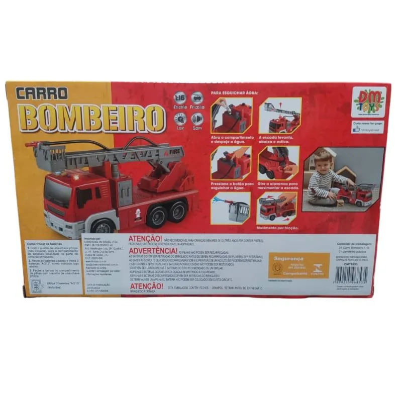O carrinho caminhão de bombeiro da DM Toys tem ricos detalhes. Possui luz, som e mecanismo de fricção. A escada se movimenta. Aperte o botão para esguichar água! Brincar de bombeiro vai ser mais divertido! Comprimento 24cm (escala 1:16).Características:– Marca: DM Toys– Modelo: DMT6853– Dimensões da Embalagem: 32cm, 19cm, 11cm– Código de Barras: 7899205968535– Alimentação: 03 baterias “AG13” (incluídas)Recomendado para maiores de 3 Anos.
