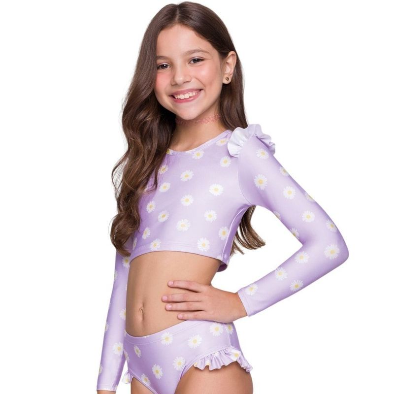 Descrição:A Camisa Cropped Selene Manga Longa Infantil é confeccionada em poliéster e elastano, oferecendo conforto e flexibilidade para o dia a dia das pequenas. Com proteção UV50+, garante segurança extra contra os raios solares, ideal para momentos ao ar livre. O modelo possui manga longa com delicados detalhes em babado, agregando um toque charmoso ao visual. A gola redonda e a modelagem cropped dão um ar moderno e descolado à peça. Com design alegre e estampa divertida, essa camisa é perfeita para compor looks descontraídos e cheios de estilo para qualquer ocasião. Medidas aproximadas (cm): 2: 23x21x34 / 4: 25x23x36 / 6: 27x25x38 / 8: 29x27x40 (Largura x Comprimento x Manga.) INFORMAÇÕES: Composição: 85% Poliéster e 18% elastano Forro: 90% Poliéster e 10% elastano Gênero: Infantil Indicado: Natação