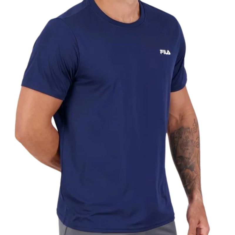 Tecnologia FPS 50+: Fator de proteção UV, que evita o contato da pele com raios solares e garante uma excelente performance durante as atividades. Composição: 97% Poliéster e 03% Elastano Cor predominante: Marinho Indicado para: Treino Gênero: Masculino. Manga curta gola careca: Dimensões aproximadas (A x L): P: 66 x 50 cm M: 68 x 52 cm G: 70 x 54 cm GG: 72 x 56 cm EG: 74 x 58 cm EEG: 76 x 60 cm