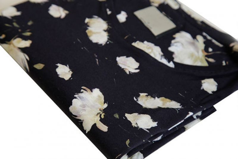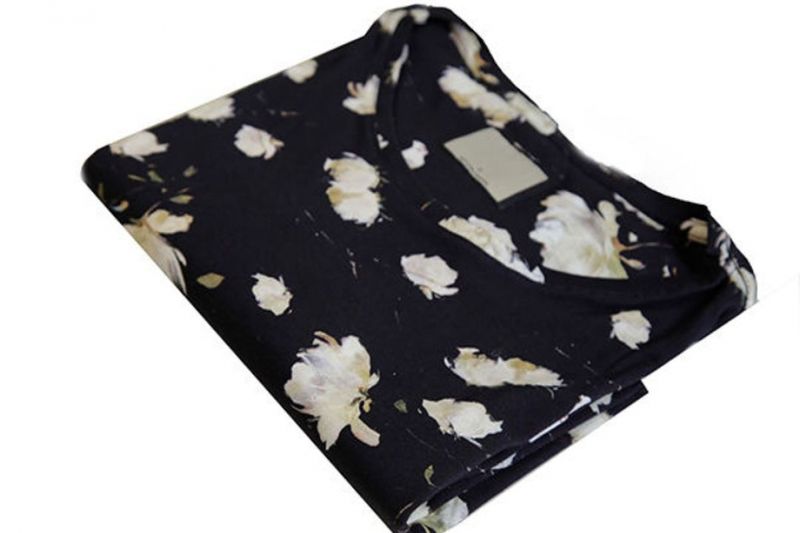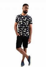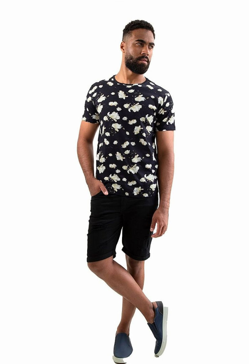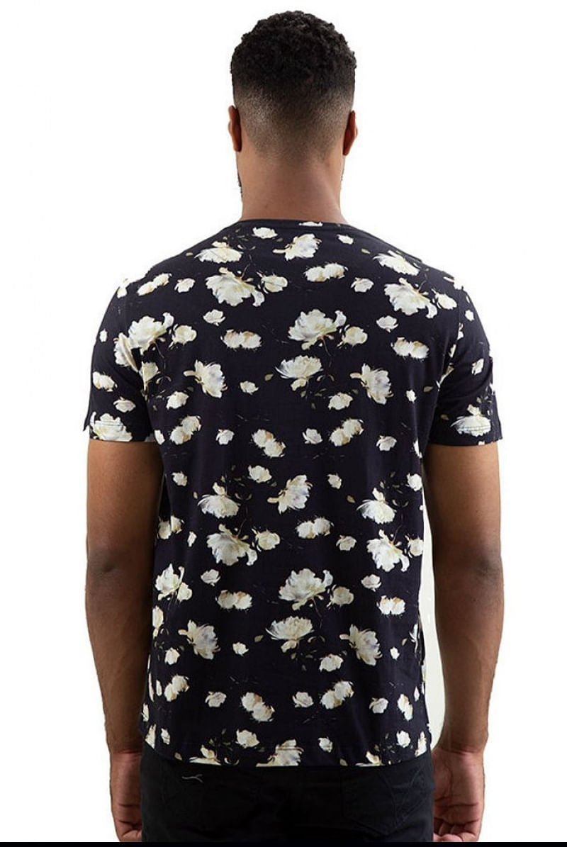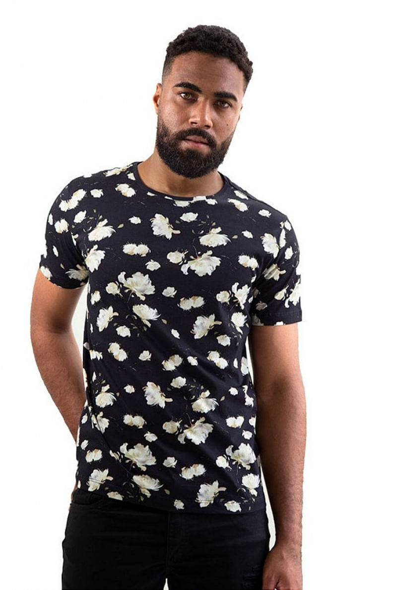 CAMISETA BÁSICA ESTAMPADA FLORAL PRETA Camiseta básica fabricada em malha penteada de algodão fio 30 com toque macio. Estampa digital de folhagem com ar sofisticado e cheio de estilo. Caimento regular, que se adapta ao corpo com conforto. Gola redonda na própria malha, reforço na pala interna 100% algodão