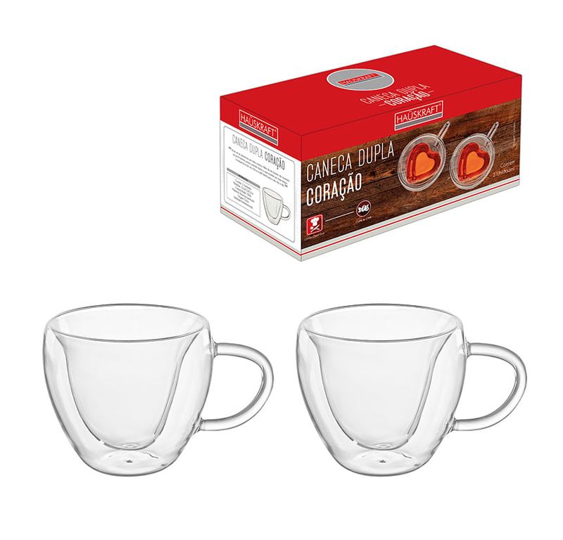 CANECA DUPLA CORAÇÃO 9CM JOGO 2 PEÇAS - Dimensões da Peça: 13,5 x 9,5 x 9,2cm - Dimensões da Embalagem: 21,5 x 11 x 10cm - Quantidade Master: 12 Peças - Dimensões Master: 45 x 35 x 23cm - Material: Vidro borossilicato - Cor: Transparente - Tipo de Embalagem: Caixa litografada - Marca: Haüskraft - Origem: China - Capacidade: 230ml - Espessura da borda: 5mm - Contém: 2 unidades - Perigos: - Evite quedas para não danificar o produto. - No caso de quebra, poderá causar cacos cortantes e perfurantes. - Antes de usar: - Lave a peça com sabão neutro e seque com pano seco e macio. - Atenção: - Utilize as canecas para tomar café, chá, qualquer bebida de sua preferência. - Indicação: - Indicado para uso no dia a dia. - Cuidados: - Não use produtos abrasivos para limpeza da peça paraGarantia do produto: 90 dias de garantia de acordo com o Código de Defesa do Consumidor + a Garantia do Fabricante